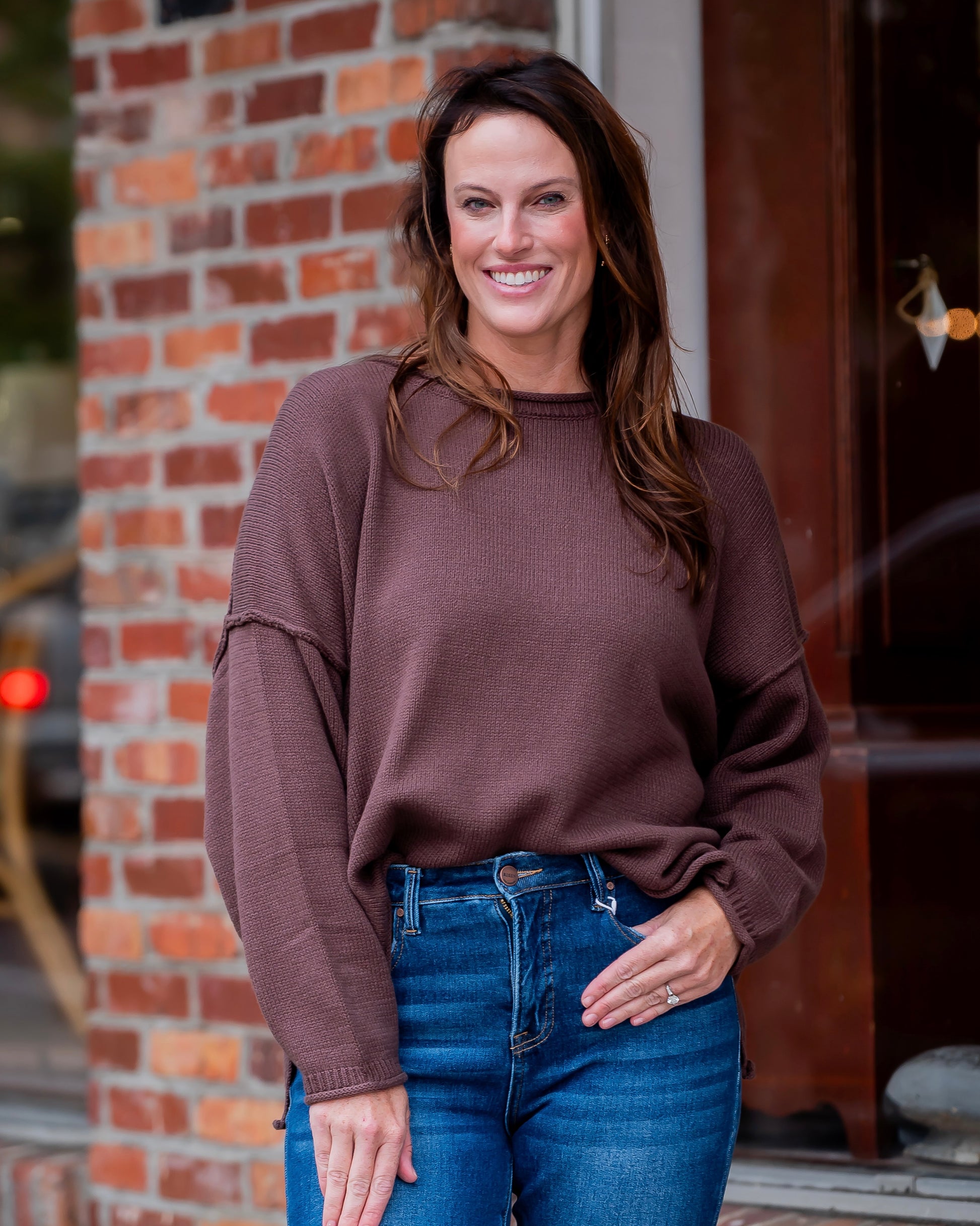 This knit pullover sweater features a cozy round neckline and long sleeves with an extended drop shoulder for a relaxed fit. The raw edge detail and ribbed trim add subtle texture to its solid design. Lightweight and unlined, it’s perfect for layering with ease and comfort throughout the day.