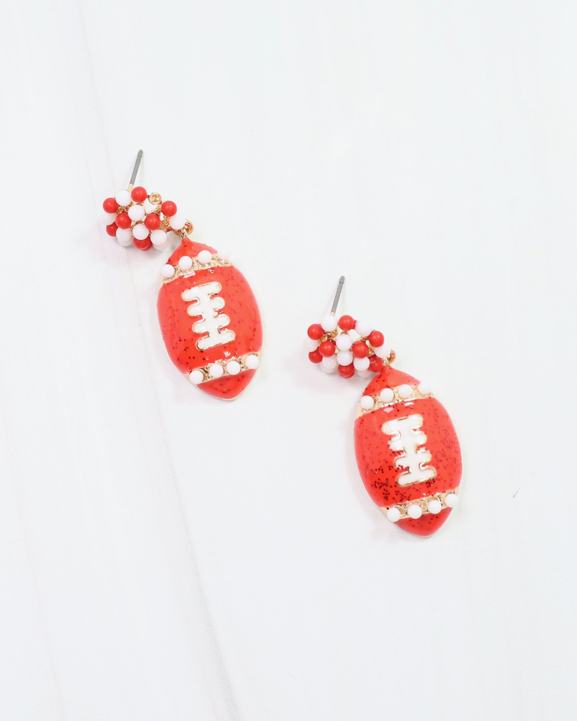 Show your team spirit with the Adler Football Earring in Red and White. This playful stud features a glittery enamel football accented with detailed laces and seed bead embellishments. Perfect for Friday night games or adding a sporty touch to any outfit, these earrings bring fun and flair to your game day look.