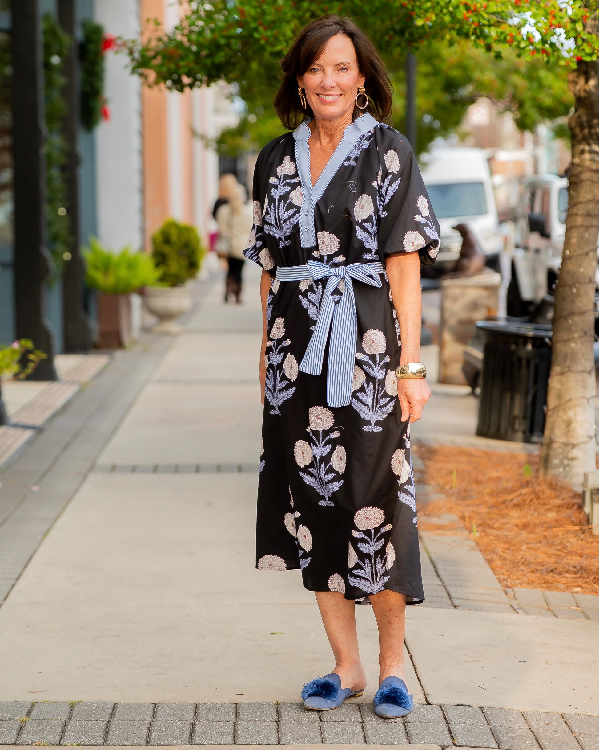 Bloom in style with this charming maxi dress featuring a delicate stem floral print and playful contrast striped trim. The short puff sleeves add a touch of whimsy, while the adjustable self-tie waist lets you customize your fit. Fully lined for comfort and confidence all day long.