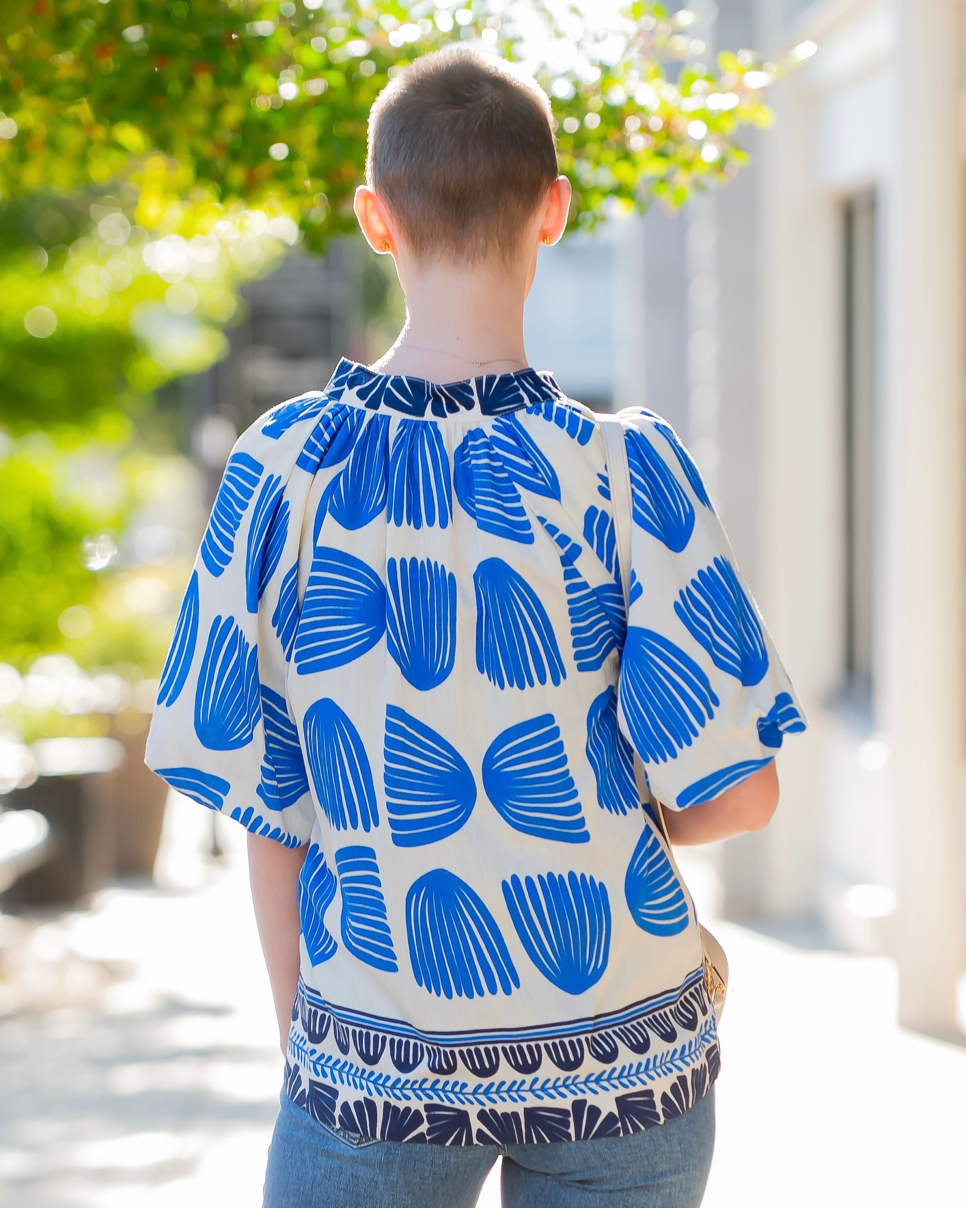 Effortlessly chic and undeniably fun, the Brea Bubble Sleeve Top features a flattering V-neckline and playful puff ¾ sleeves with elastic cuffs for that perfect balance of comfort and style. The shell block border print adds visual interest, while delicate scalloped edges elevate the look. Its relaxed, flowy silhouette is ideal for everything from casual outings to weekend adventures.