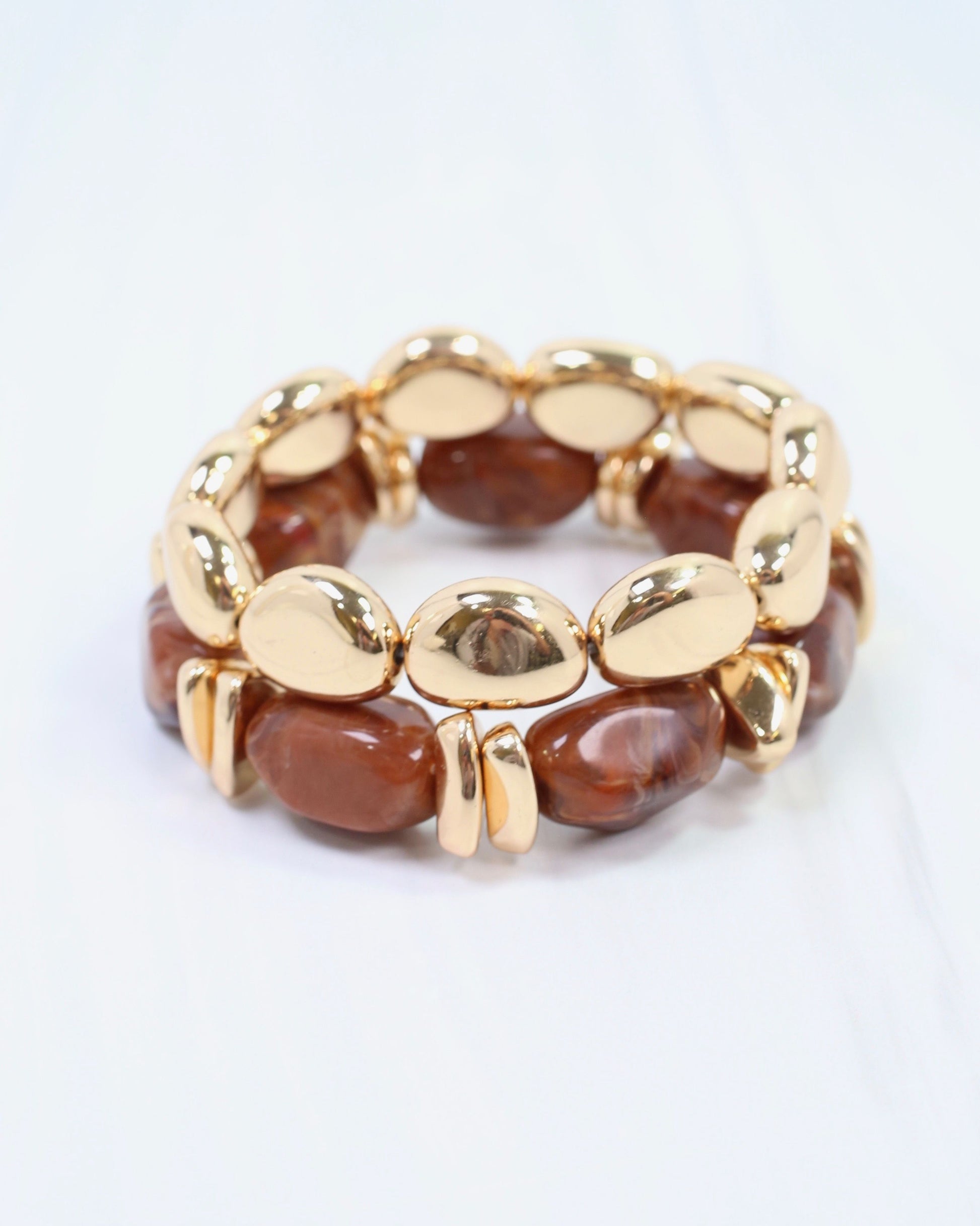 Add a stylish edge to your accessories with the Arcadia Stone Bracelet Brown 2-piece set. Featuring one bracelet adorned with a mix of gold and warm brown stones, paired with a sleek all-gold bracelet, this duo offers a fashionable and fun way to complement any outfit. Perfect for layering or wearing separately for versatile style.