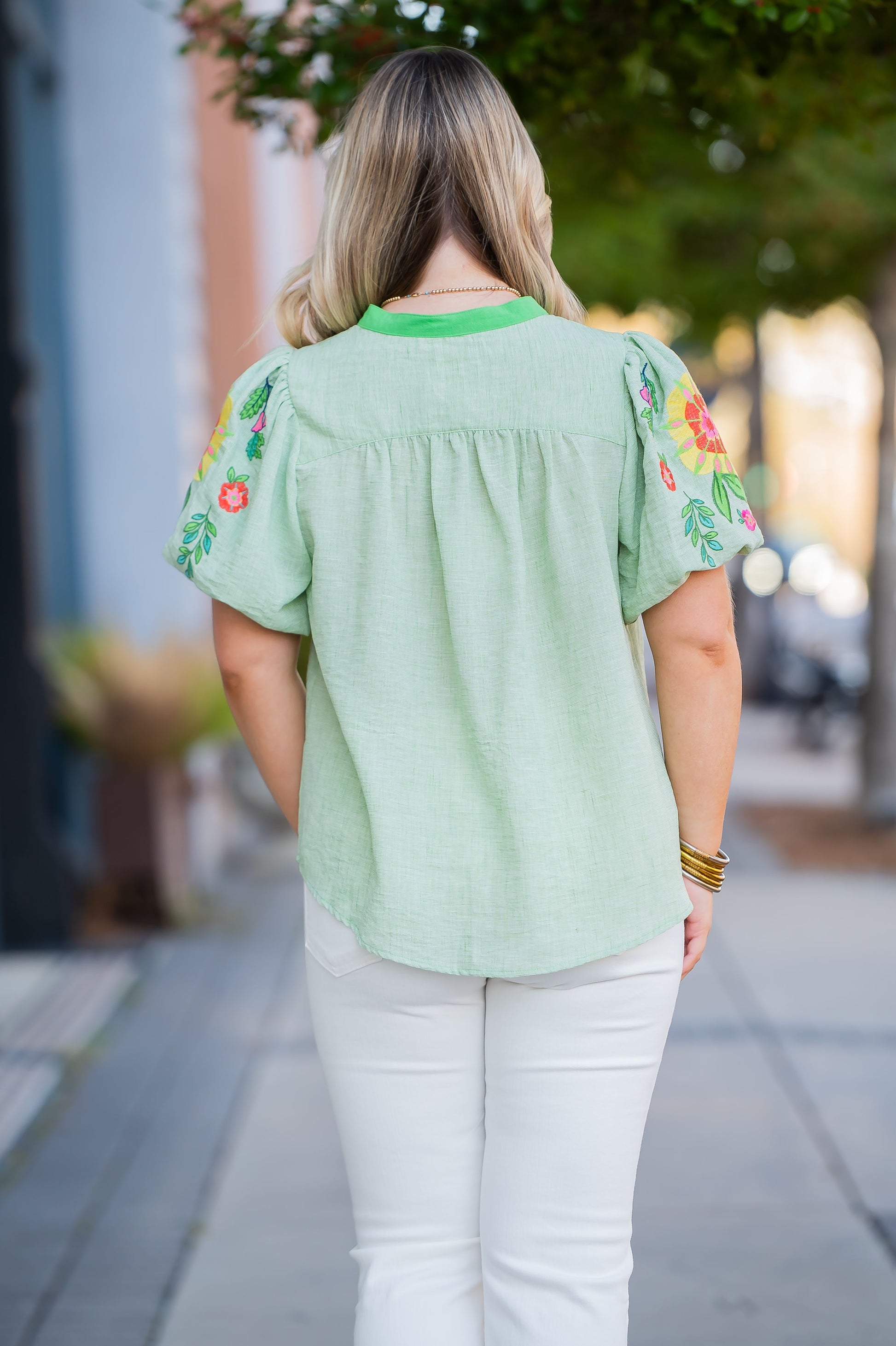 Mila Embroidered Puff Sleeve Top Elevate your everyday style with this charming puff sleeve top featuring delicate embroidered details. The flattering split V-neck creates an effortlessly chic silhouette, while short puff sleeves with elastic cuffs add playful dimension and movement. Unlined for breathable comfort, this piece transitions seamlessly from casual days to weekend adventures. Perfect for layering or wearing solo, Mila brings personality and polish to any wardrobe.
