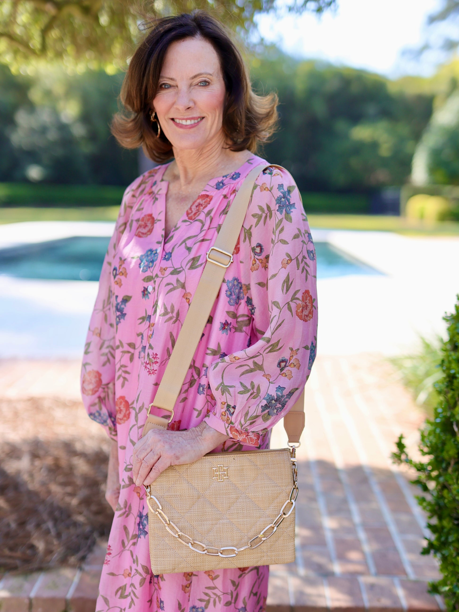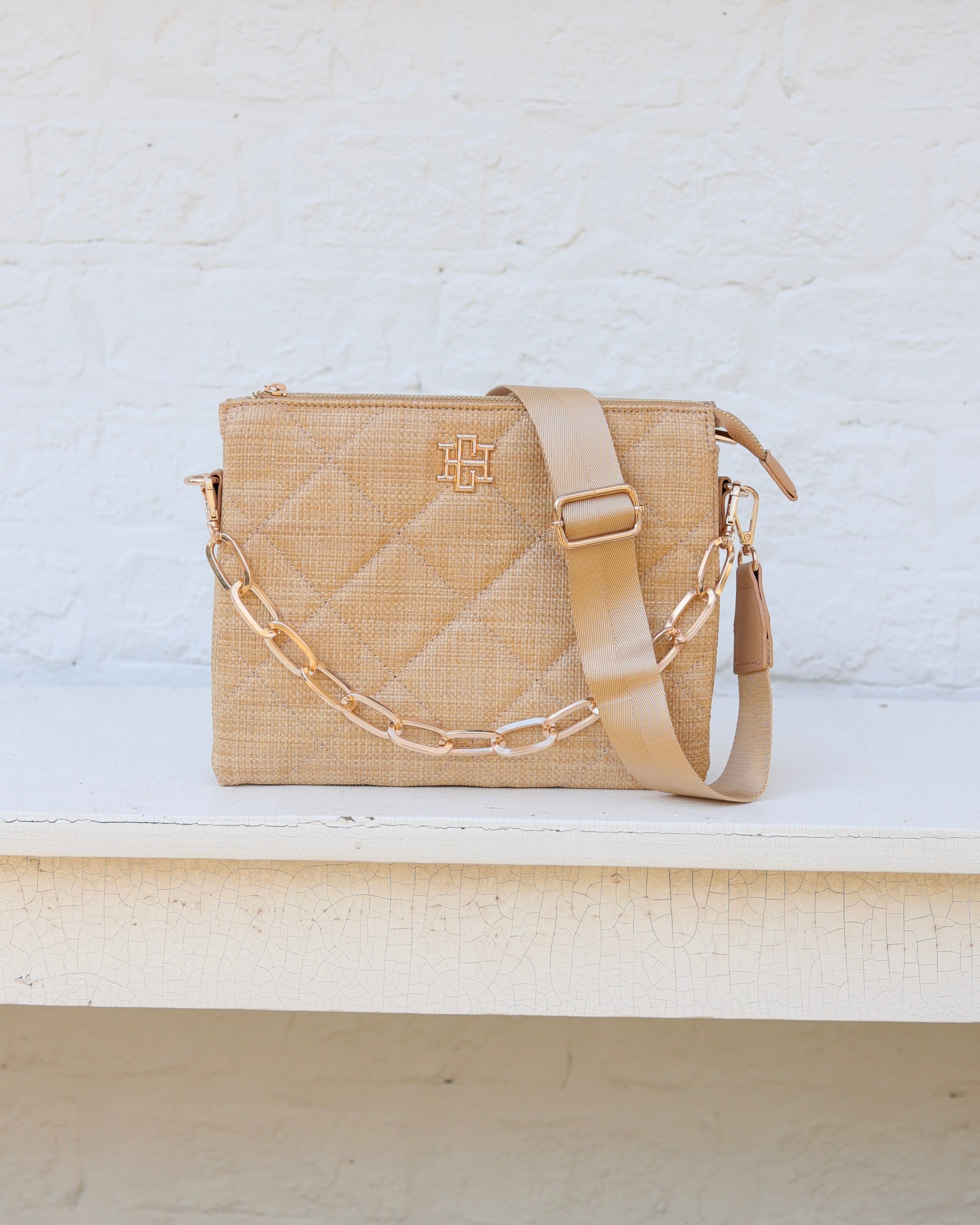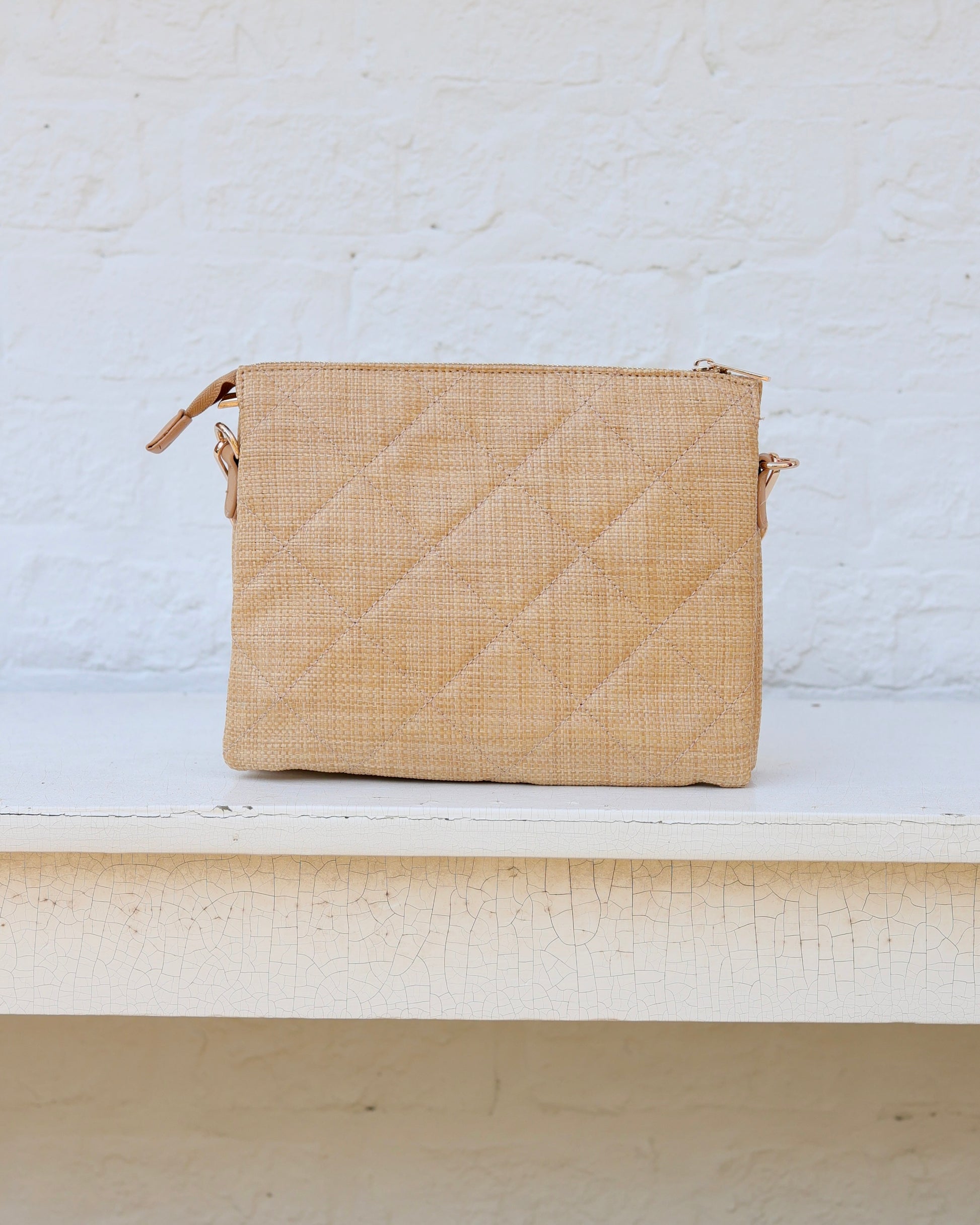 This quilted straw crossbody is so fashion forward! It has a chunky gold chain accent that is removable, and it can be used as a carrying strap as well. The nylon crossbody strap is super stylish and is also adjustable and removable. The top zipper closure leads to two open compartments as well as a third middle zippered section. It also has two smaller internal open pockets and one zippered pocket