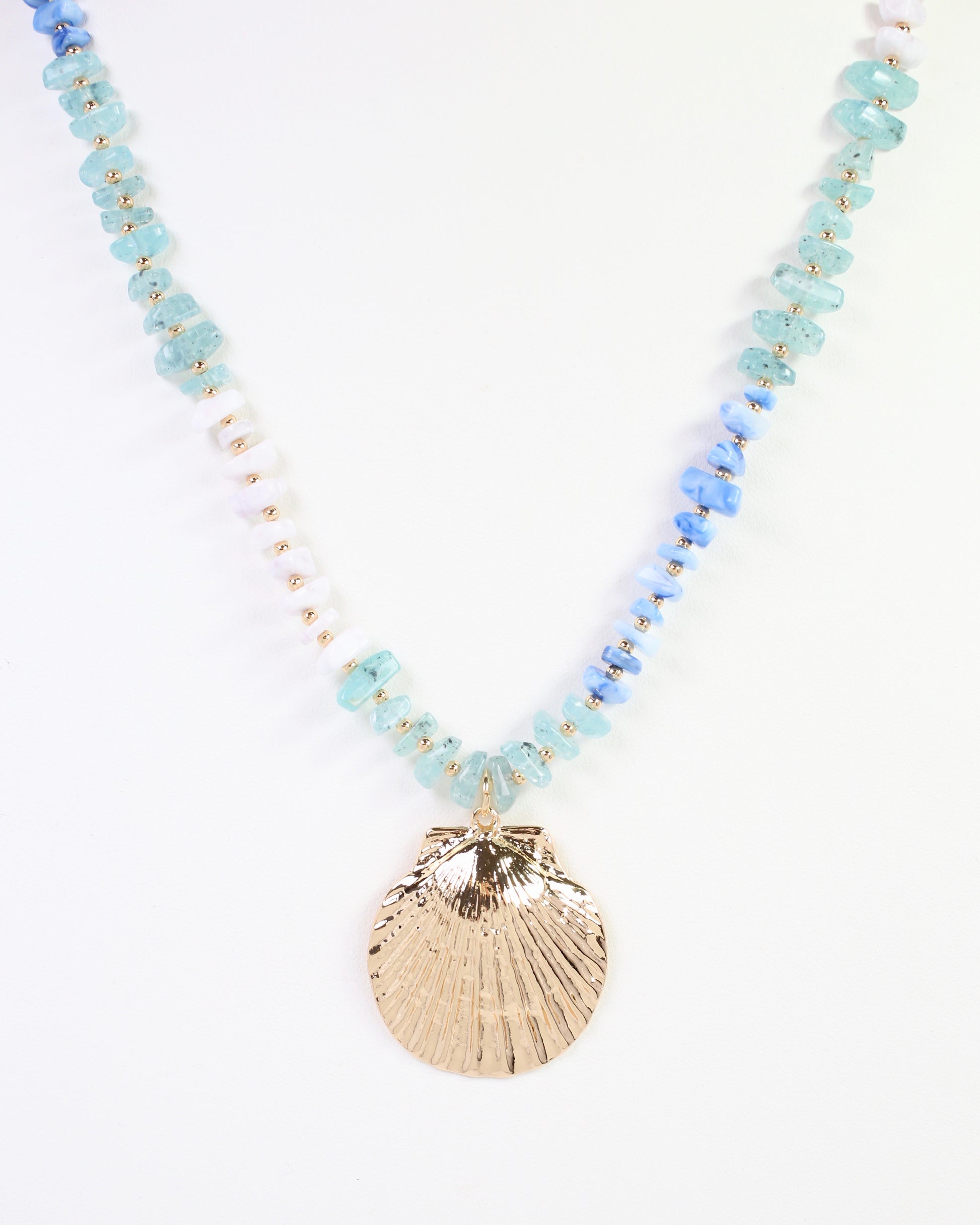 Delicate blue stone beads in soft, layered hues create an understated elegance, anchored by a textured gold shell pendant that catches the light beautifully. This geometric design brings a coastal-inspired sophistication to any ensemble, perfect for layering or wearing solo. A versatile piece that transitions effortlessly from day to evening wear.