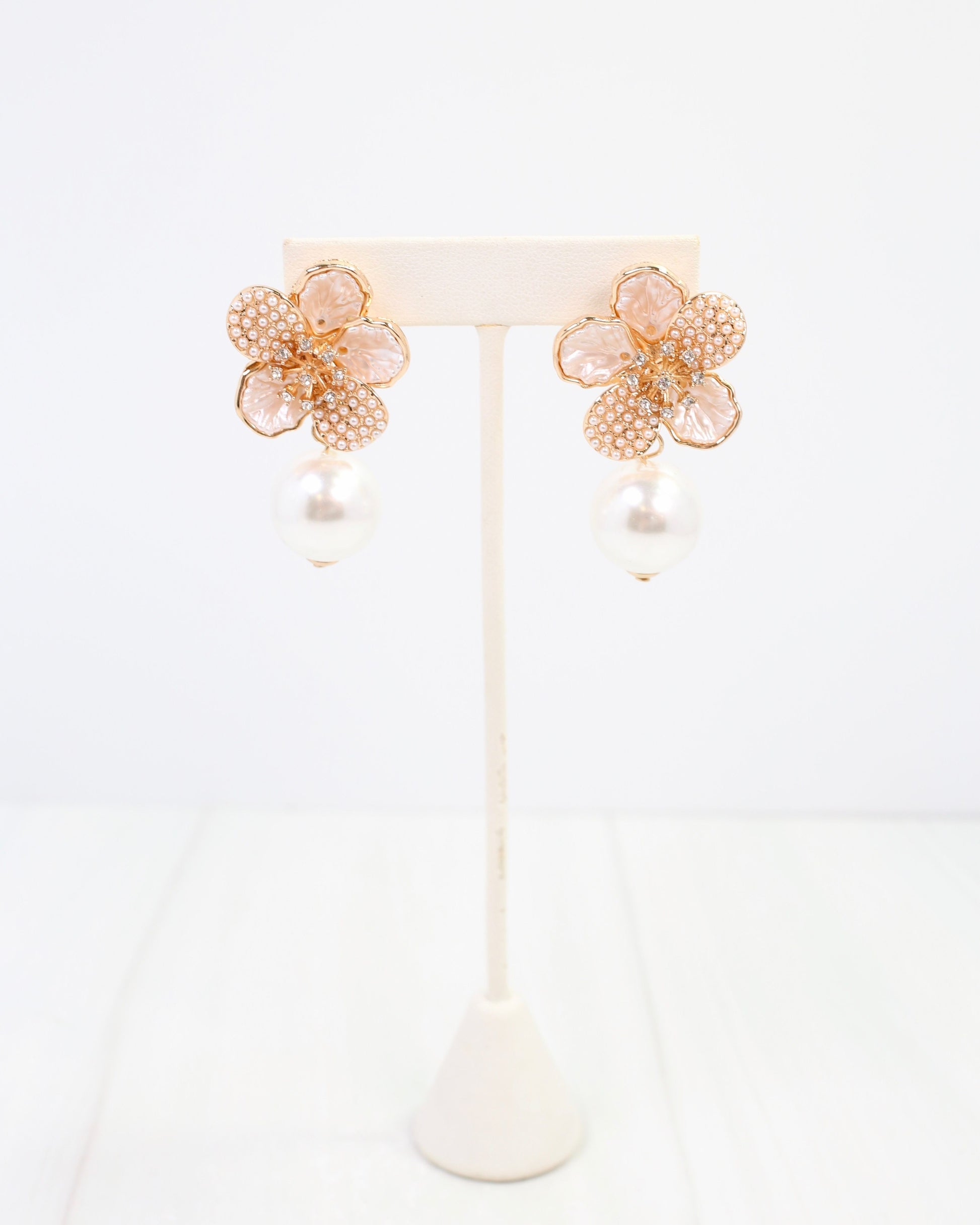 Delight in the Ashland Pearl Embellished Flower Earring Gold, featuring delicate light pink petals accented with sparkling CZ pistils. Two petals shimmer with mini pearls, adding a touch of playful elegance. Perfect for adding a fashionable, fun flair to any outfit.