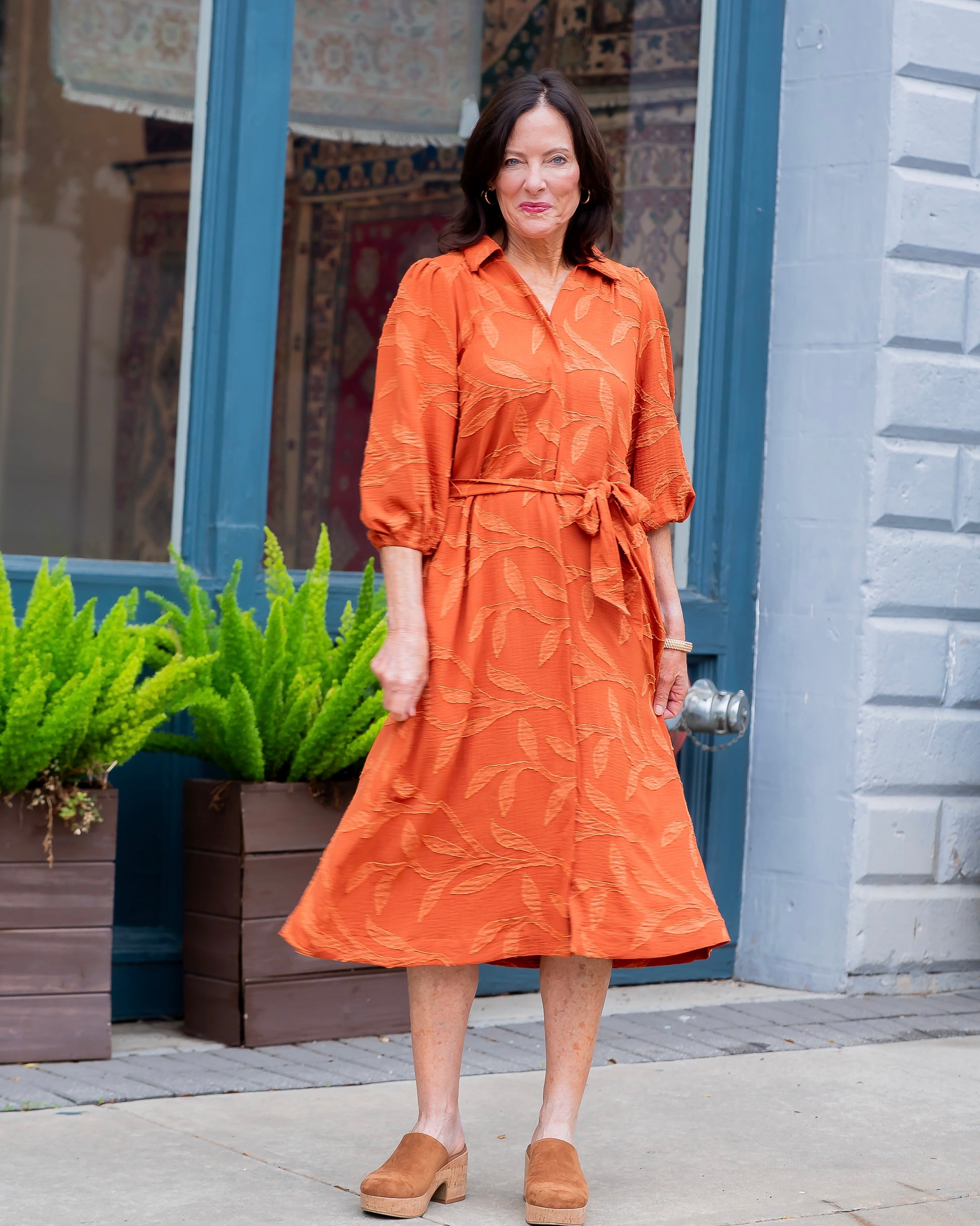 The Auroral Jacquard Midi Dress shines in a stunning orange hue with delicate tone-on-tone applique for subtle texture. Its midi length and adjustable self-tie belt let you customize your fit, while the 3/4 sleeves with elastic cuffs add a playful bounce to your look. The button-down front makes it easy to slip on, so just add boots and you’re off in effortless style!