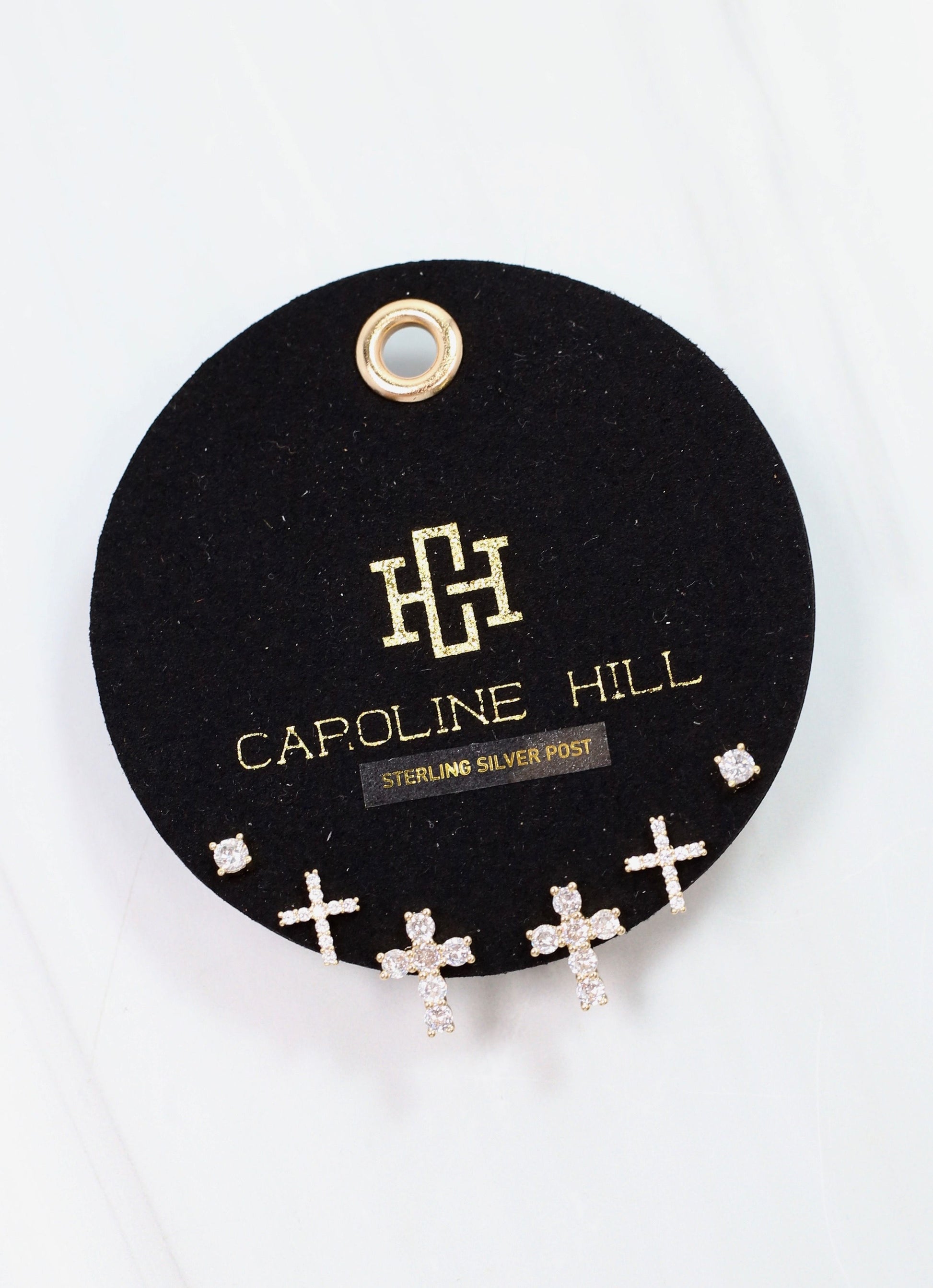 This branded earring set is stunning. It has two CZ lined cross earring and a CZ stud as well. It is a great set to choose from to pair nicely with any outfit.