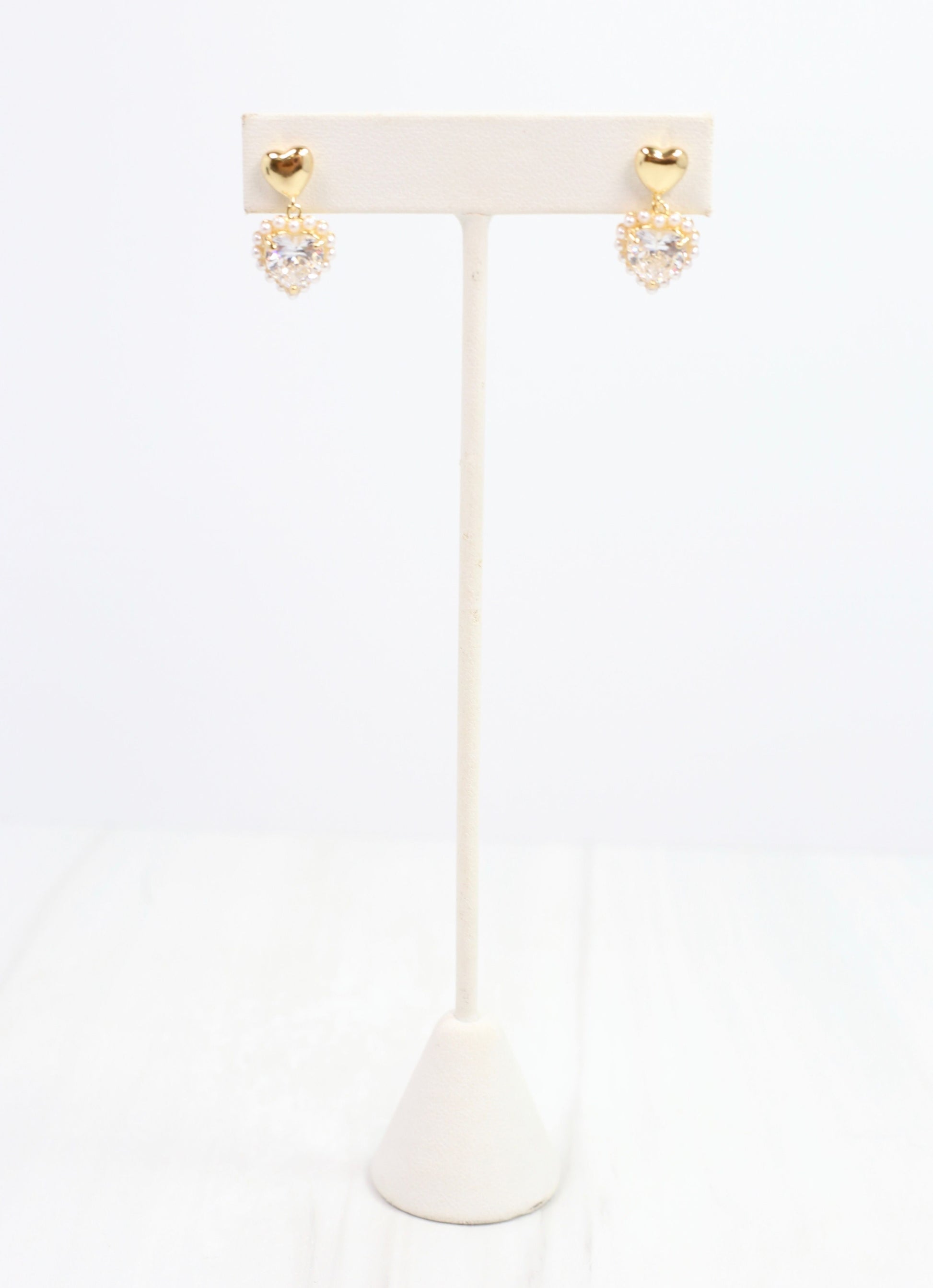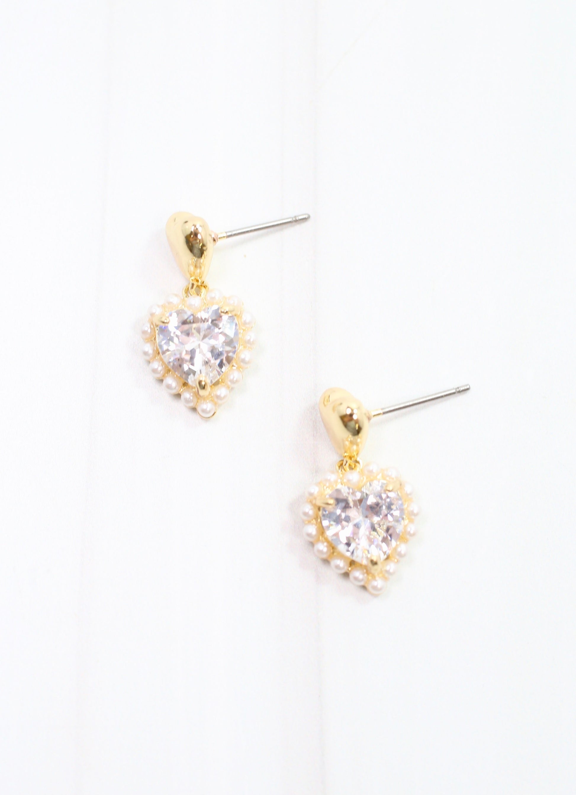This precious earring has a shiny gold heart post with a crystal heart drop surrounded by petite pearls.