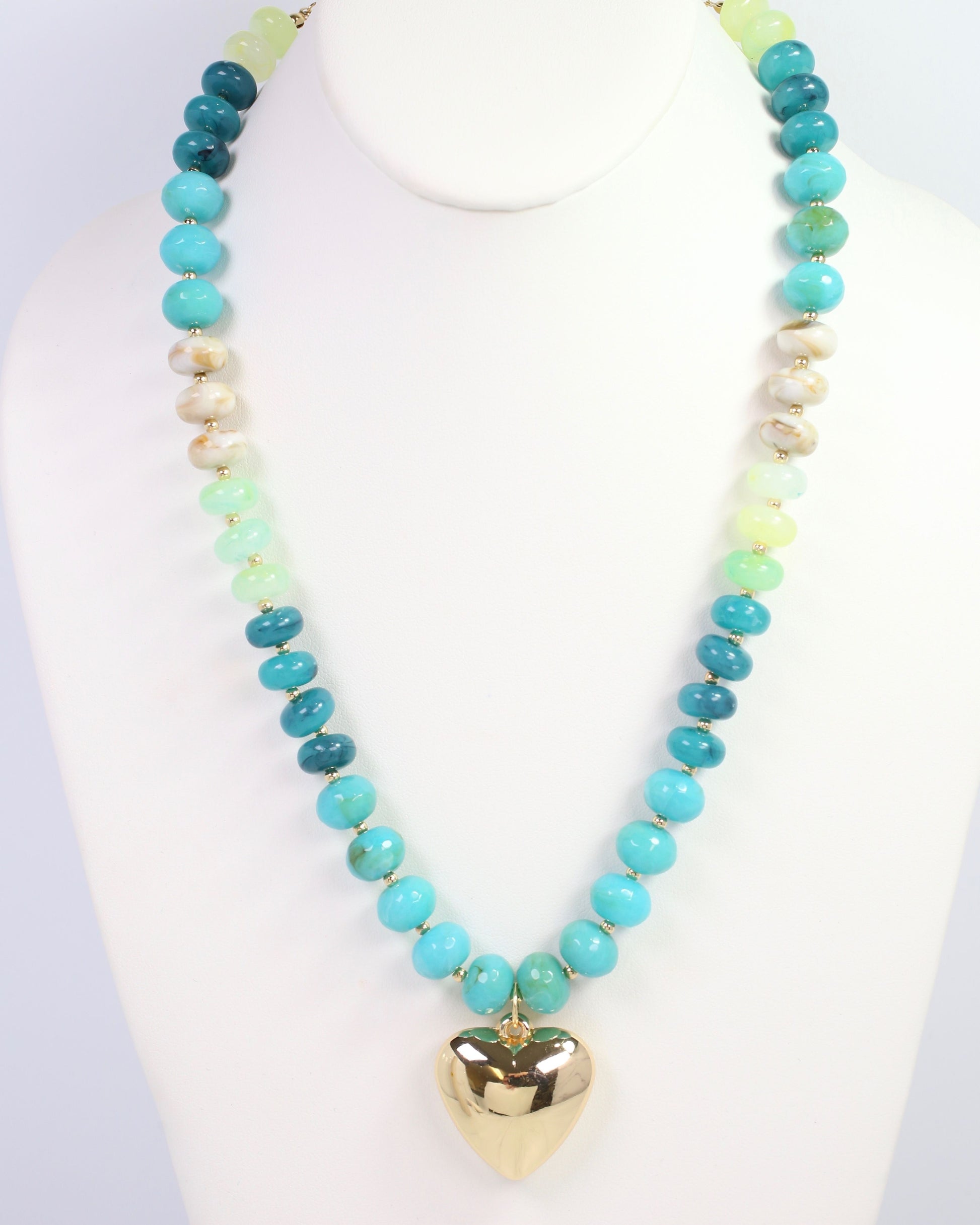 The Belmont Stone Beaded Heart Necklace in Turquoise features beautiful stone beads accented by a charming heart pendant. This fashionable necklace adds a touch of elegance and playful romance, making it a perfect accent to elevate any look with vibrant color and style.