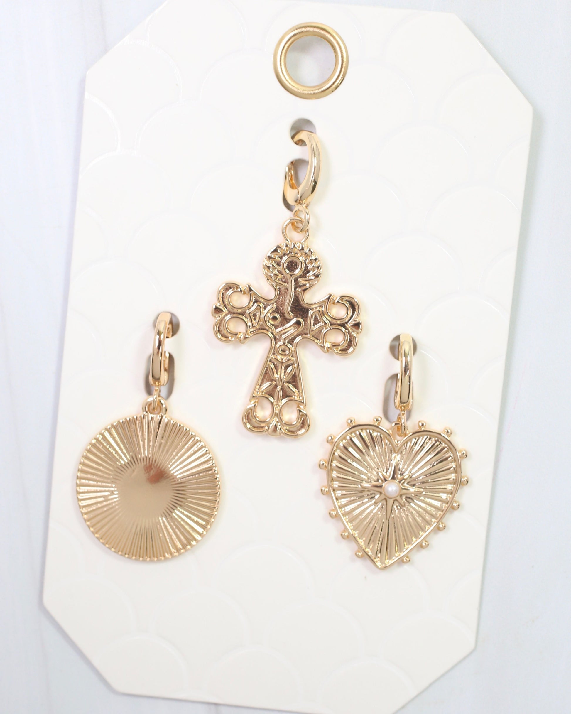 Add a stylish touch to your scarf necklace with this fashionable 3-charm set featuring a circle, cross, and heart. The heart charm stands out with a pearl nestled in its center, bringing a fun and elegant vibe to your look. Crafted in gold, this set is the perfect accessory to mix and match with your favorite scarves.