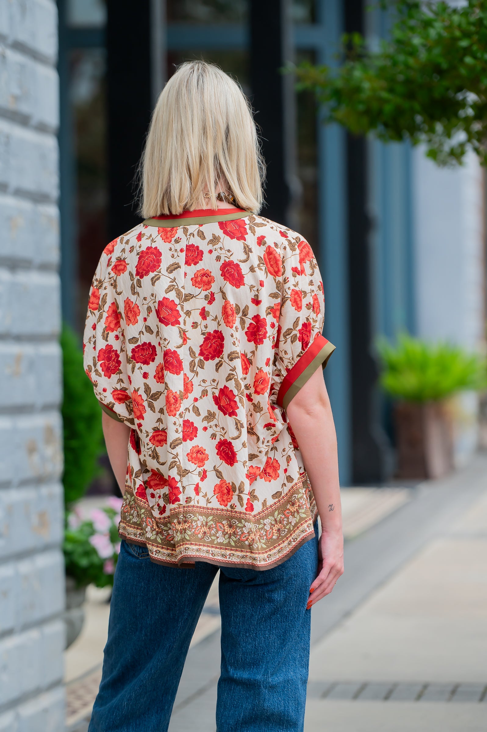 Bring charm to your wardrobe with the Williams Floral Top. This short sleeve design features a vibrant rust floral print on a creamy background, complemented by a playful contrast green and rust V-neck and hem panel. Lightweight and unlined, it offers a breezy fit perfect for sunny days and stylish outings.