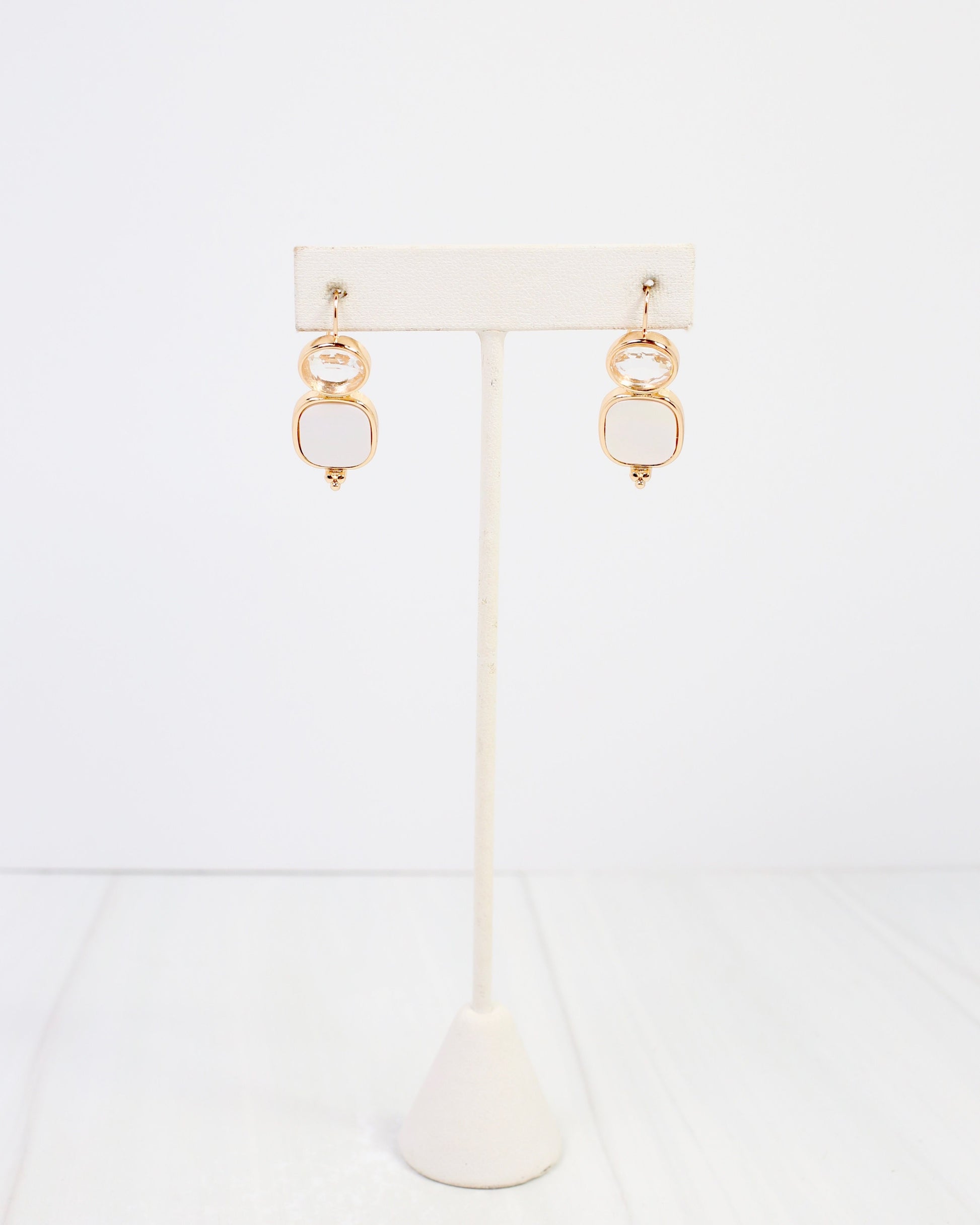 The Bloomington Drop Earrings feature radiant mother-of-pearl stones accentuated by sparkling CZ stones above, combining timeless elegance with refined sparkle. A sophisticated choice to enhance any ensemble.