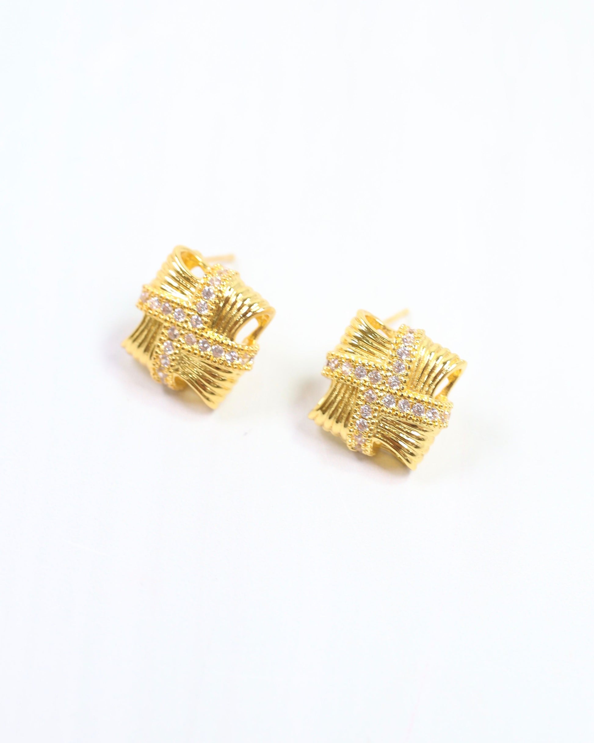Elevate your everyday look with the Bonita Basketweave Stud in Gold. Featuring a chic square basketweave design accented with sparkling cubic zirconia, these gold-dipped brass earrings add a subtle yet stylish touch to any outfit. Perfect for daily wear or making a refined statement, they combine durability with timeless fashion.