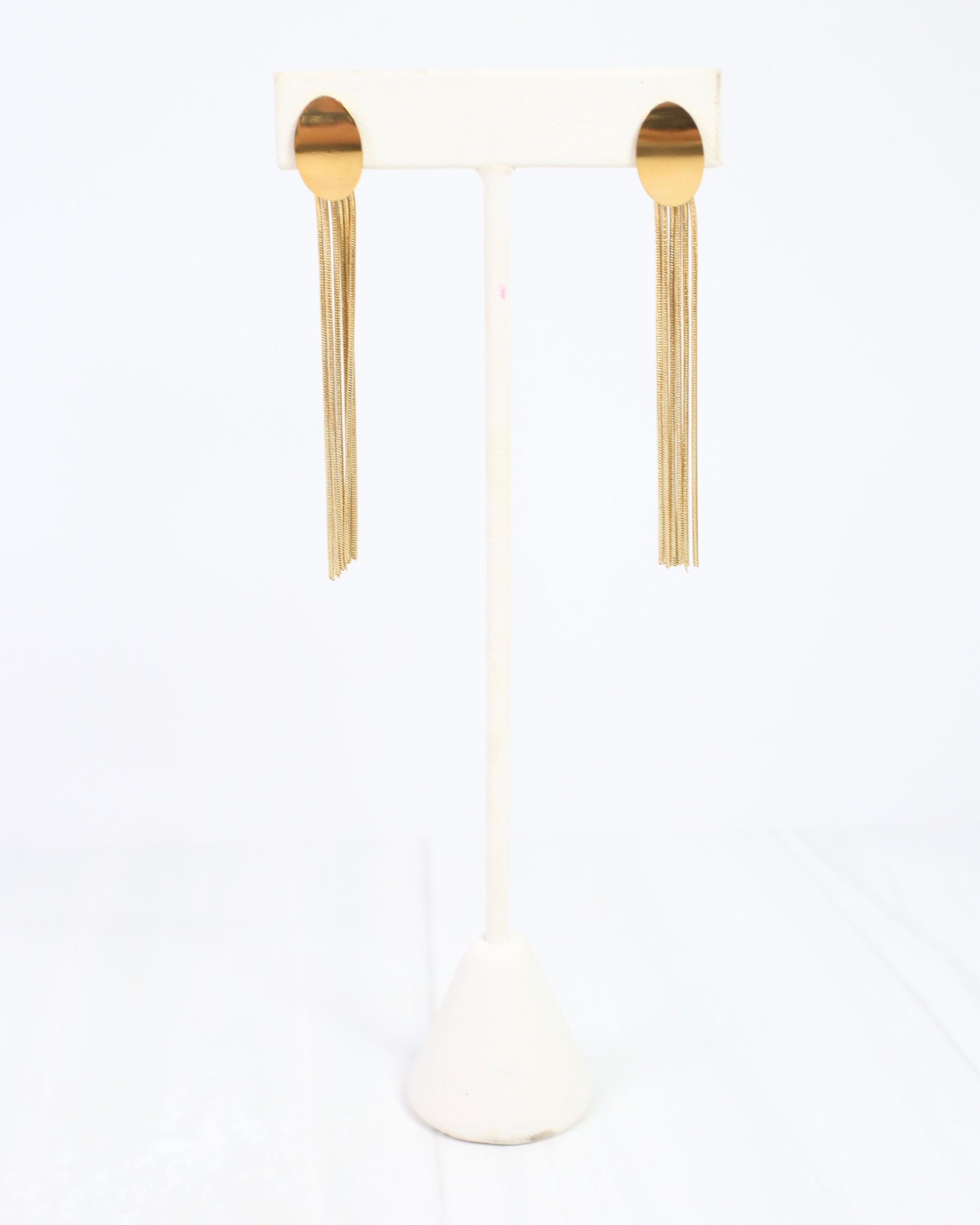 Elevate your style with the Boulder Dangle Earrings in Gold. Featuring a sleek gold snake chain fringe that sways with every movement, these earrings pair perfectly with a shiny oval stud for a look that’s both playful and timeless. Ideal for adding a touch of chic sophistication to any outfit, they blend classic elegance with modern flair effortlessly.