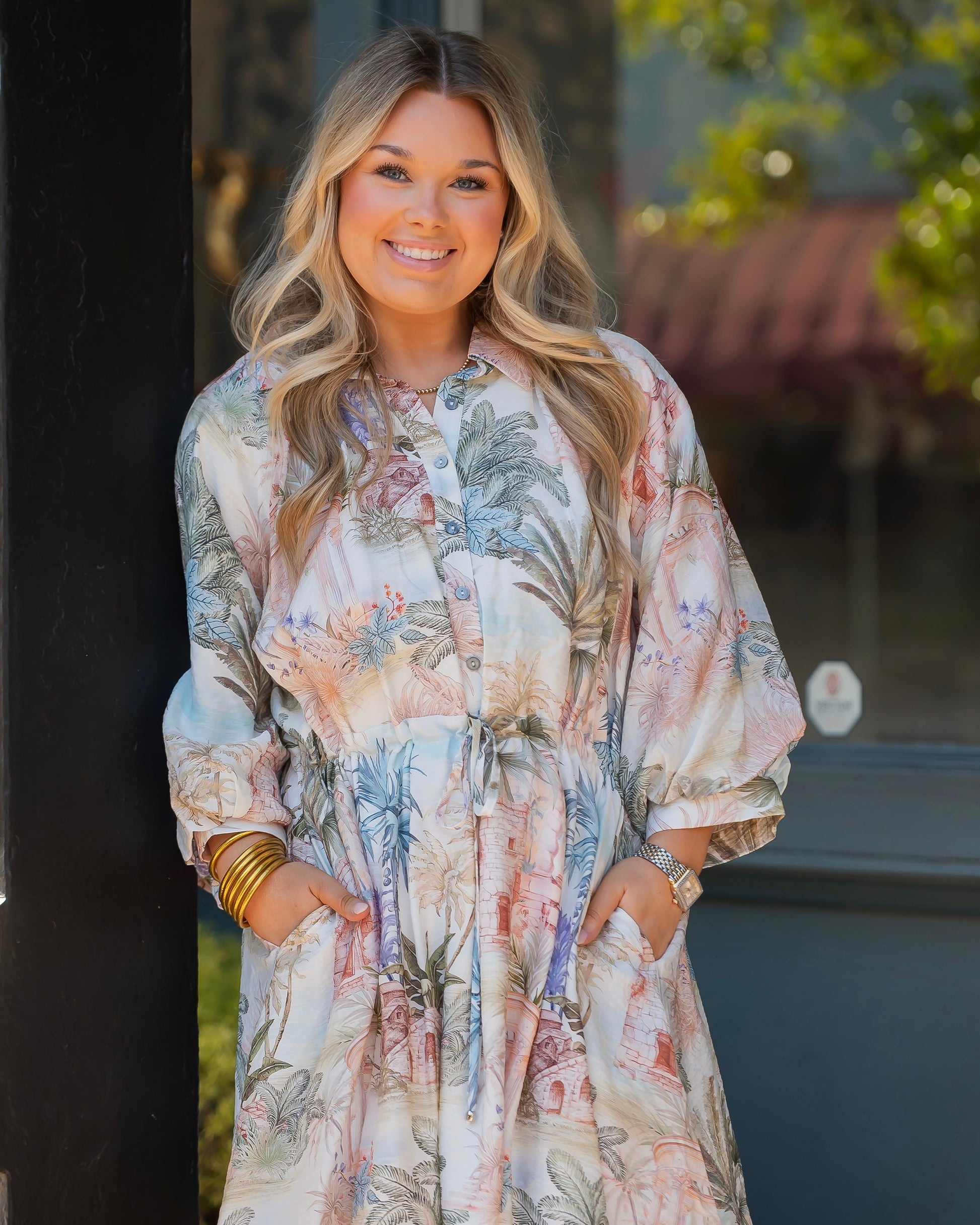 Escape to paradise with the Cove Tropical Printed 3/4 Balloon Sleeve Dress. This lightweight woven piece features a vibrant tropical print that brings effortless vacation vibes to your everyday wardrobe. The flattering balloon sleeves and elasticated drawstring waist create a comfortable, feminine silhouette, while functional side pockets keep essentials within reach. Front button closure and full lining ensure easy dressing and all-day confidence. Perfect for warm weather adventures or relaxed weekend getaways.