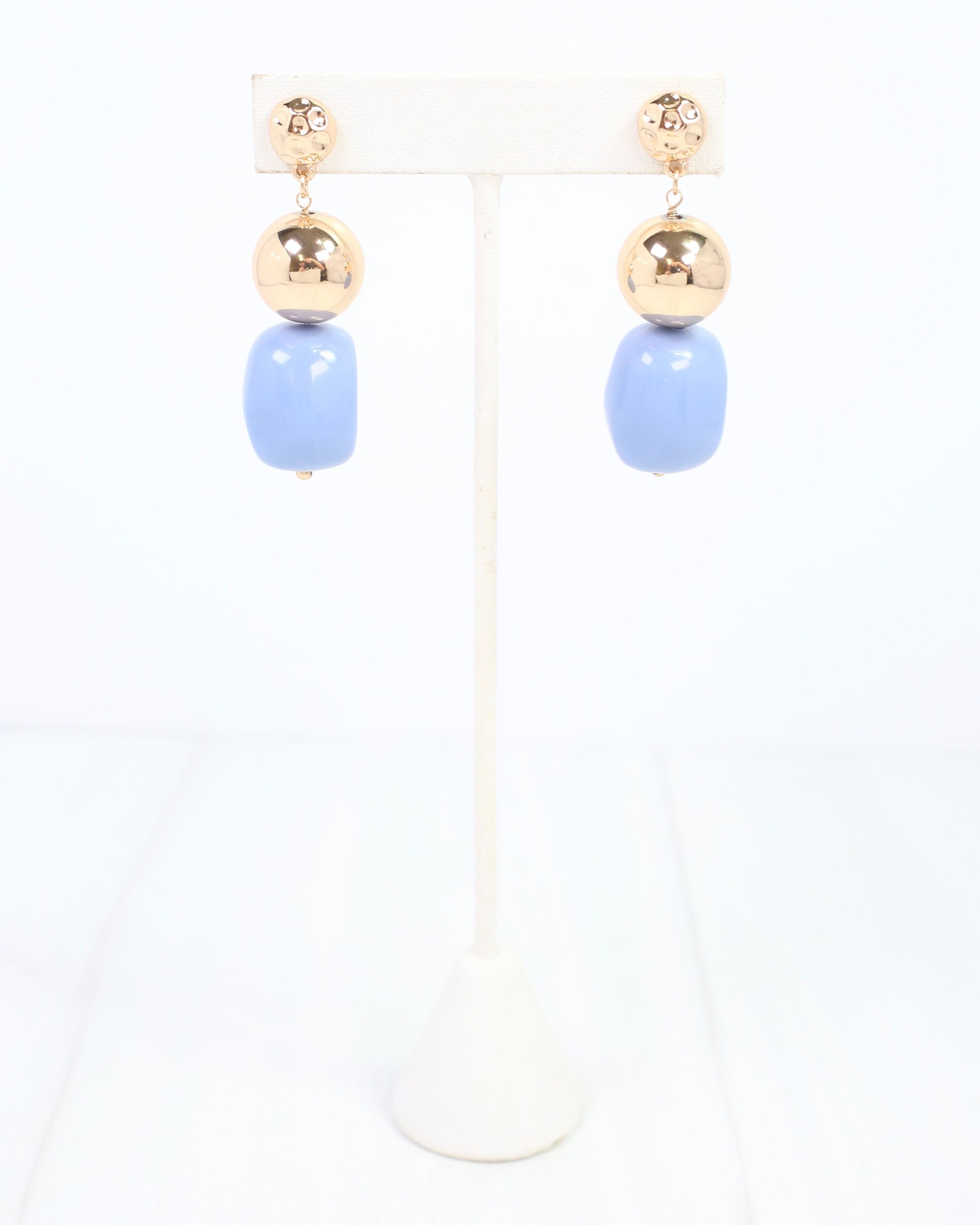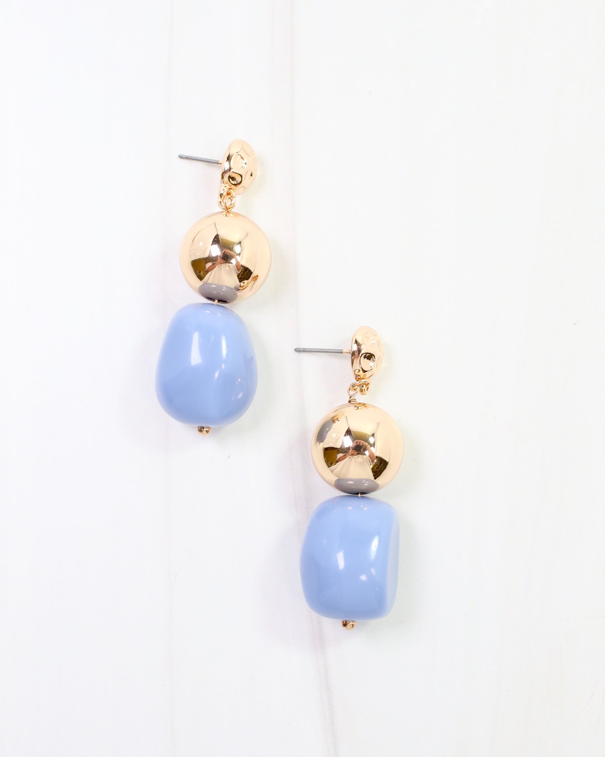 The Bridgeport Stone Dangle Earrings in Blue feature a charming triple-drop design with a hammered gold stud, shiny gold ball, and marble light blue stone dangle. Stylish and perfectly sized, these earrings make an understated yet fashionable statement for any occasion.
