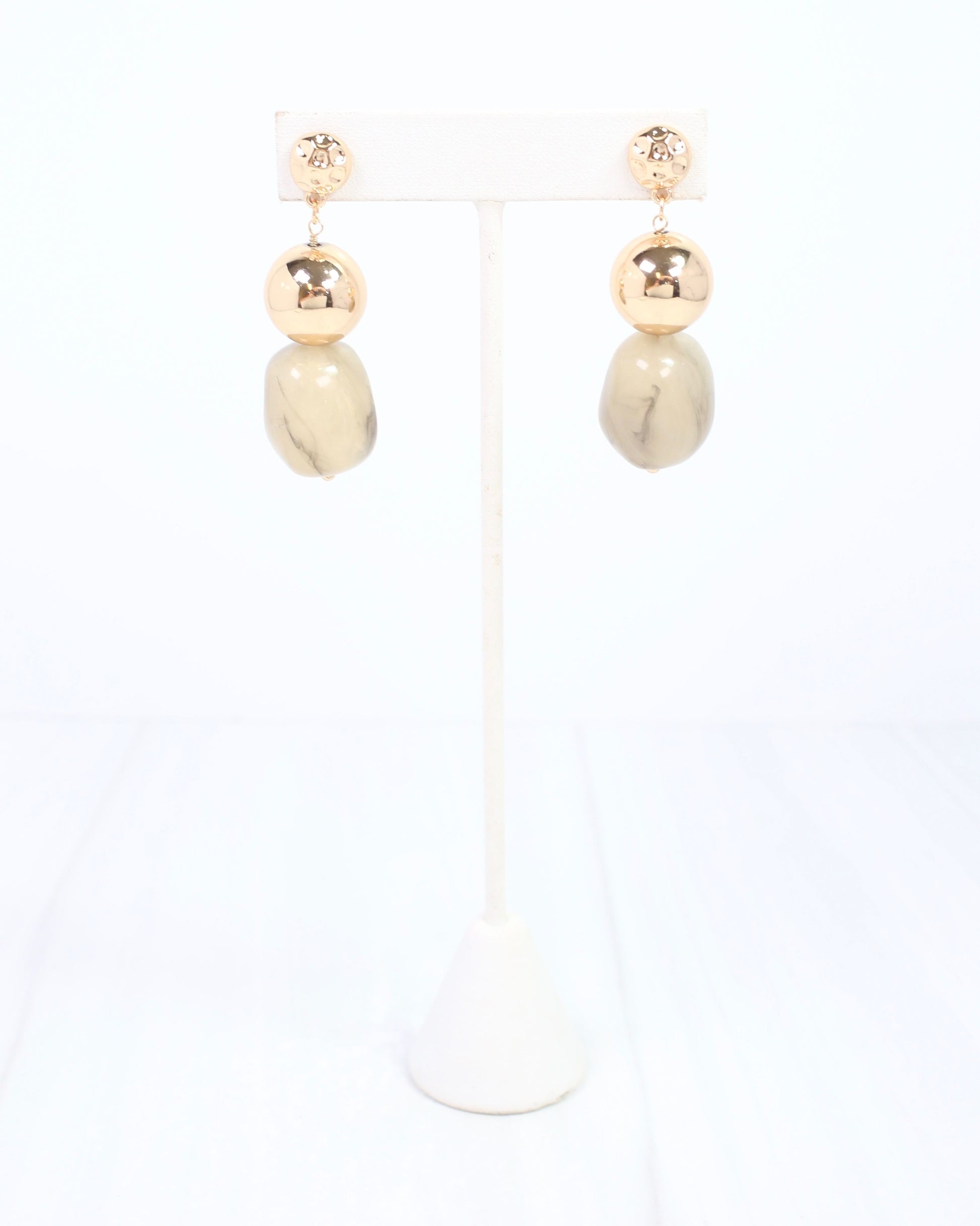 The Bridgeport Stone Dangle Earrings in Gray feature a charming triple-drop design with a hammered gold stud, shiny gold ball, and marble gray stone dangle. Stylish and perfectly sized, these earrings make an understated yet fashionable statement for any occasion.