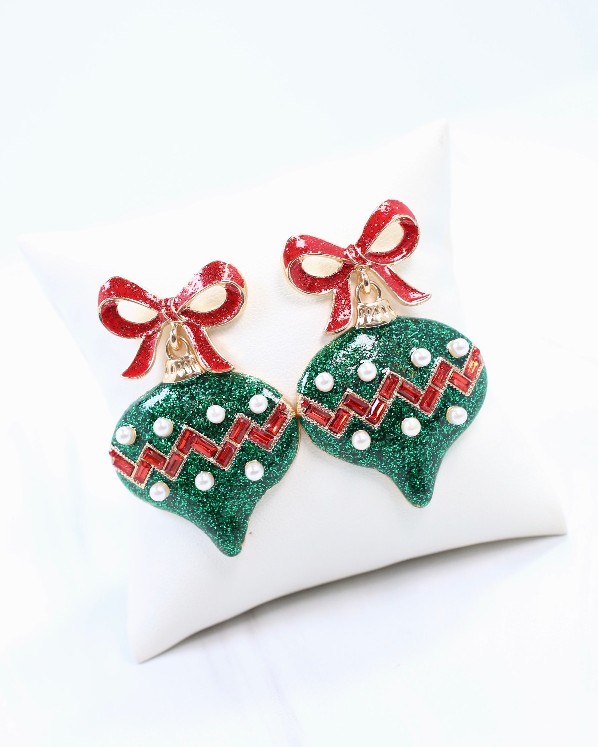 The Bridger Bow and Ornament Earrings in green feature an adorable glittered enamel red bow with a red ornament dangle. Trimmed with pearls and highlighted by green zigzag crystal stones, these statement earrings add a festive and fashionable touch to your holiday look.