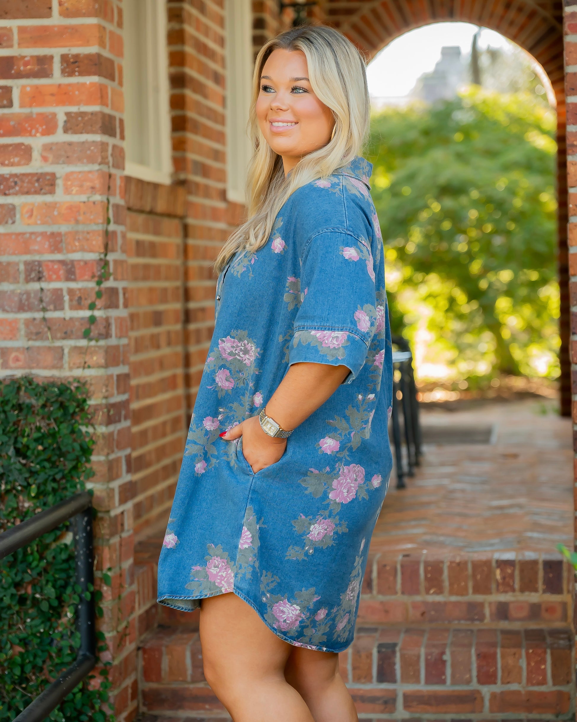 Make a statement in the Rangeley Floral Denim Dress, where timeless denim meets a charming floral print. Its elbow-length sleeves and lightweight woven fabric offer comfort and style, while the unlined, non-sheer design ensures ease and confidence. With convenient side pockets, this dress is perfect for those seeking effortless elegance every day.