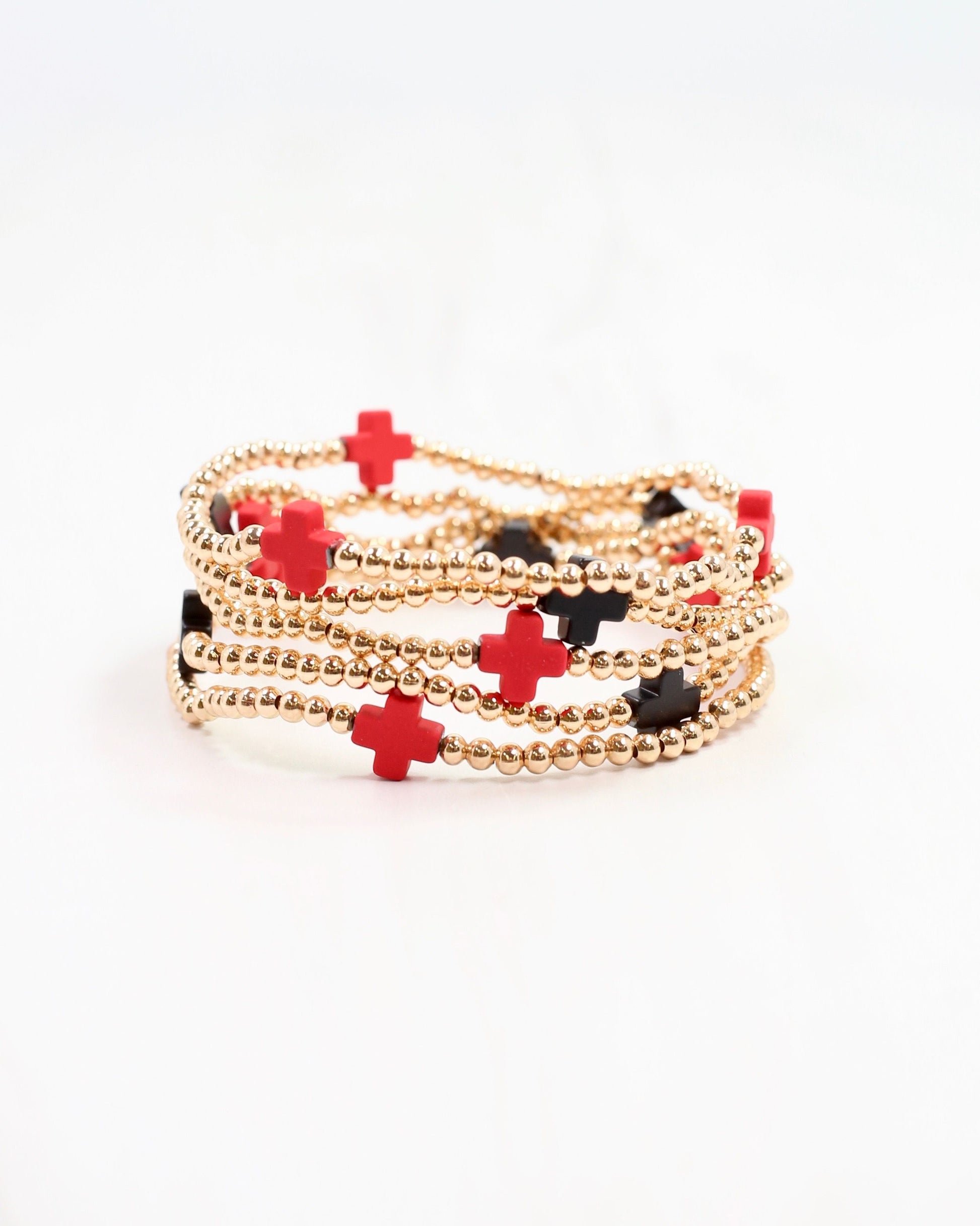 Show off your school spirit with the Brittany Cross Bracelet Set in Red and Black! These stretchy gold beaded stacking bracelets feature vibrant solid-colored crosses, adding a fun and stylish touch to any outfit. Perfect for layering or wearing solo, they’re the ideal way to celebrate your pride with a playful flair.