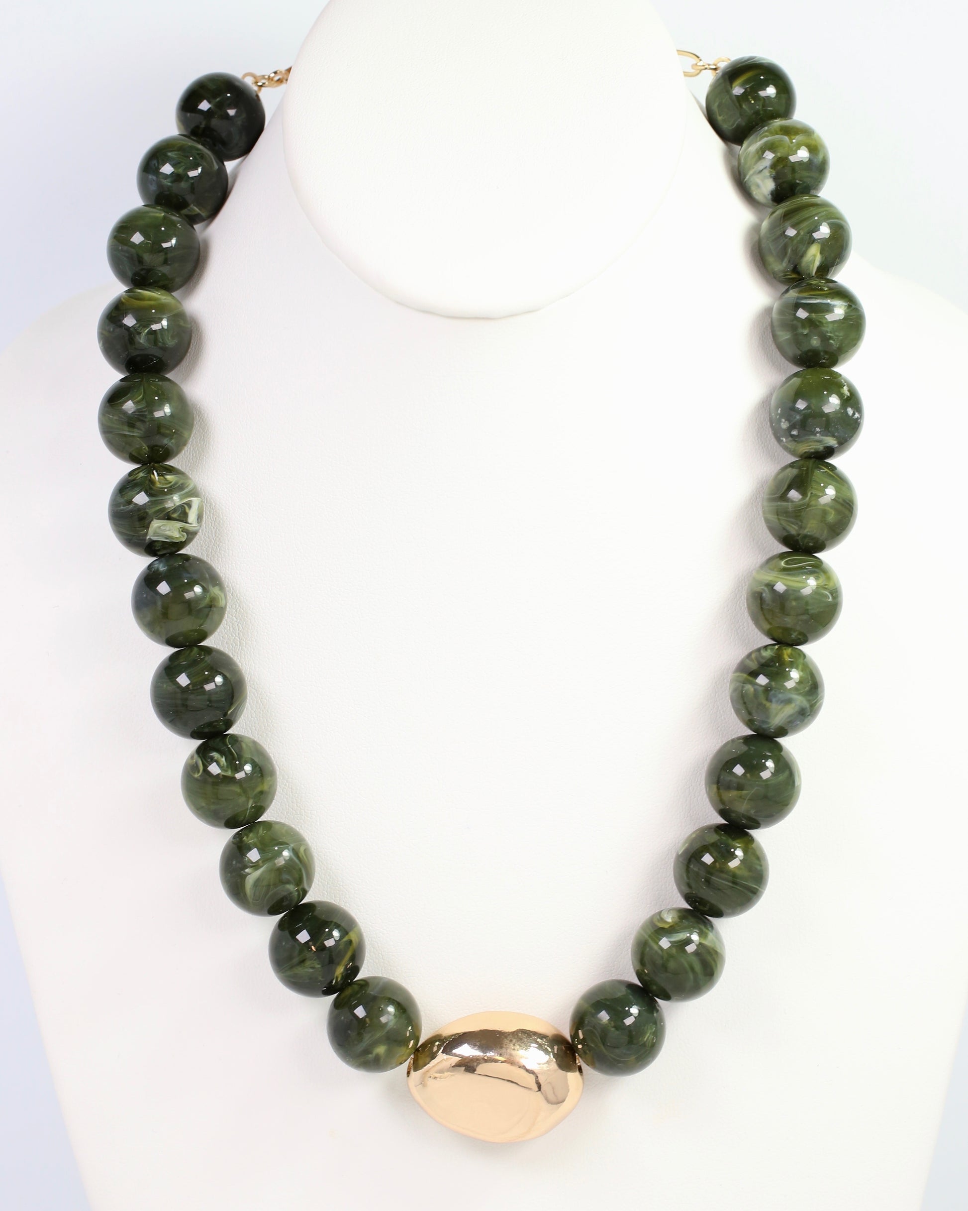 Add a pop of subtle color to any outfit with the Brooklyn Bold Stone Necklace in rich olive green. Featuring chunky marbled round beads paired with a shiny gold statement bead, this necklace brings bold style and fun energy to your look. Perfect for making a confident, colorful statement wherever you go!