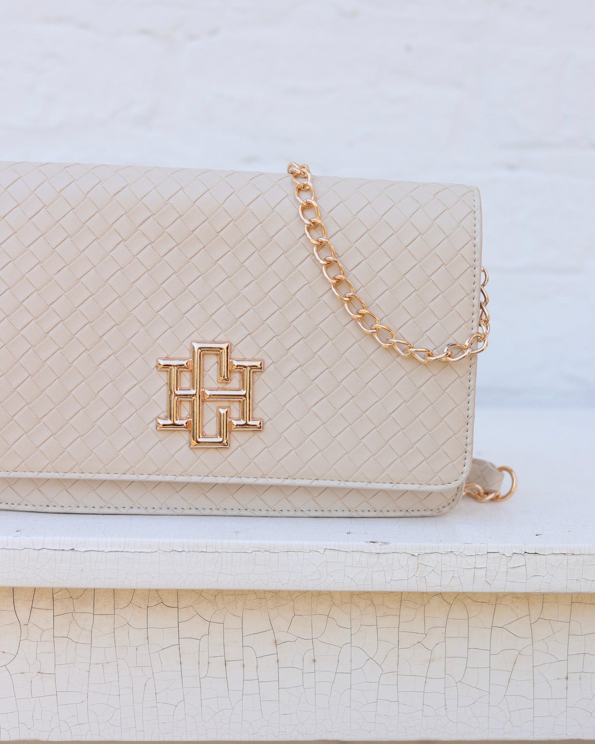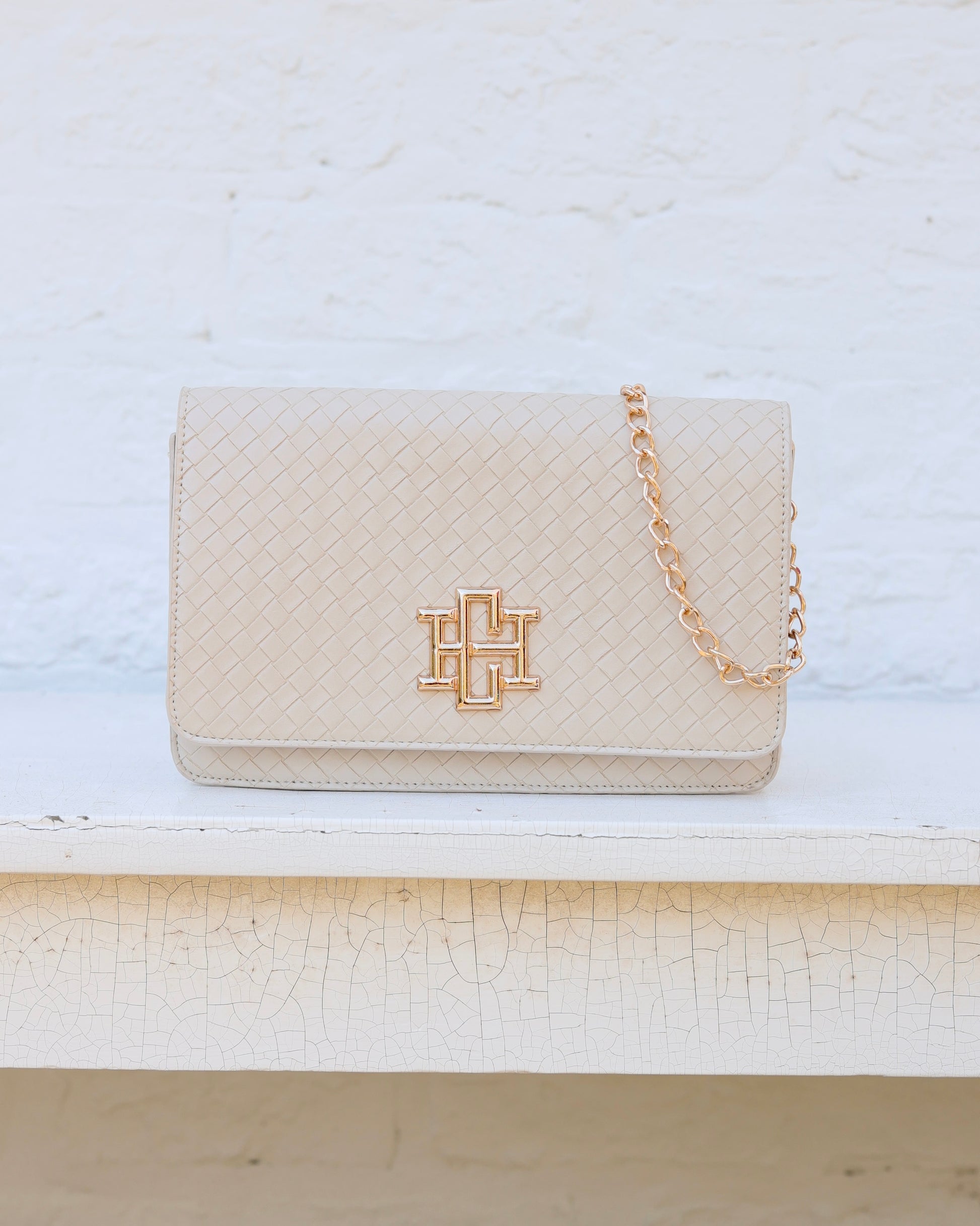 This woven vegan leather crossbody is equipped to keep you organized! There are built in credit card slots inside as well as a zippered pocket and open pocket. It features the signature, shiny gold Caroline Hill logo on the front magnetic flap. The chain crossbody strap has a strip of matching material to sit comfortably on your shoulder. It can also be removed to carry as a stylish clutch. Great for events or everyday wear!