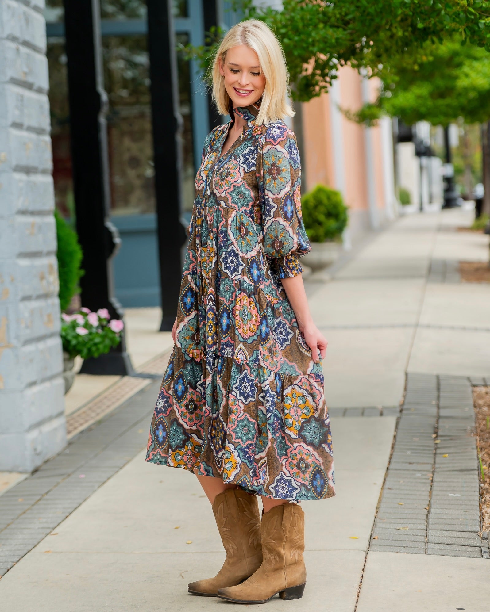 The Bryson Boho Printed Midi Dress features a flattering V-neck with a collar and elegant 3/4 length sleeves finished with elastic cuffs for a comfortable fit. Its midi length and fully lined design offer both style and ease, making it a perfect choice for a chic, effortless look.
