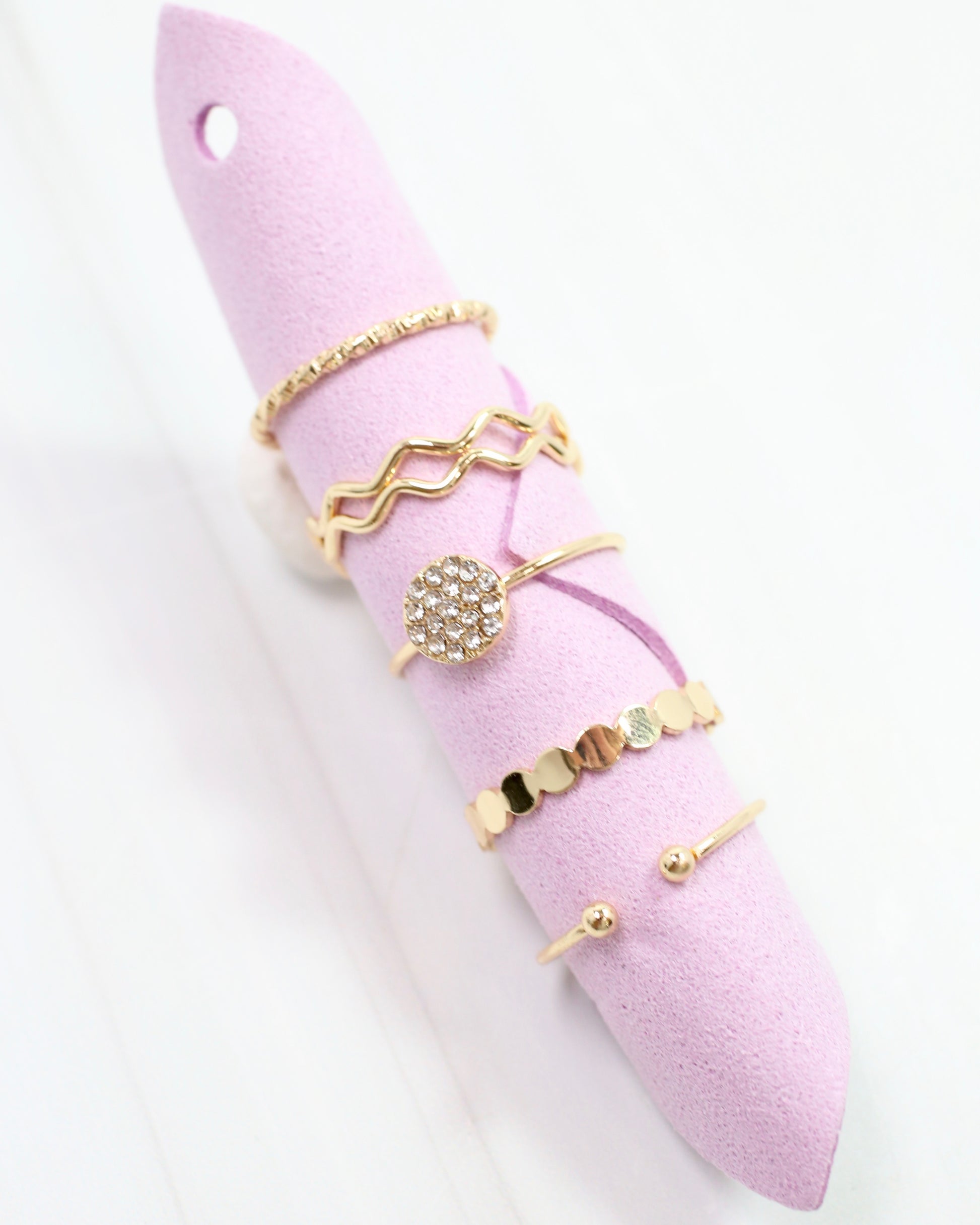 The Camden Ring Set in Gold features five playful rings—wave, dotted, pave circle, and delicate bands—perfect for stacking and mixing your style.