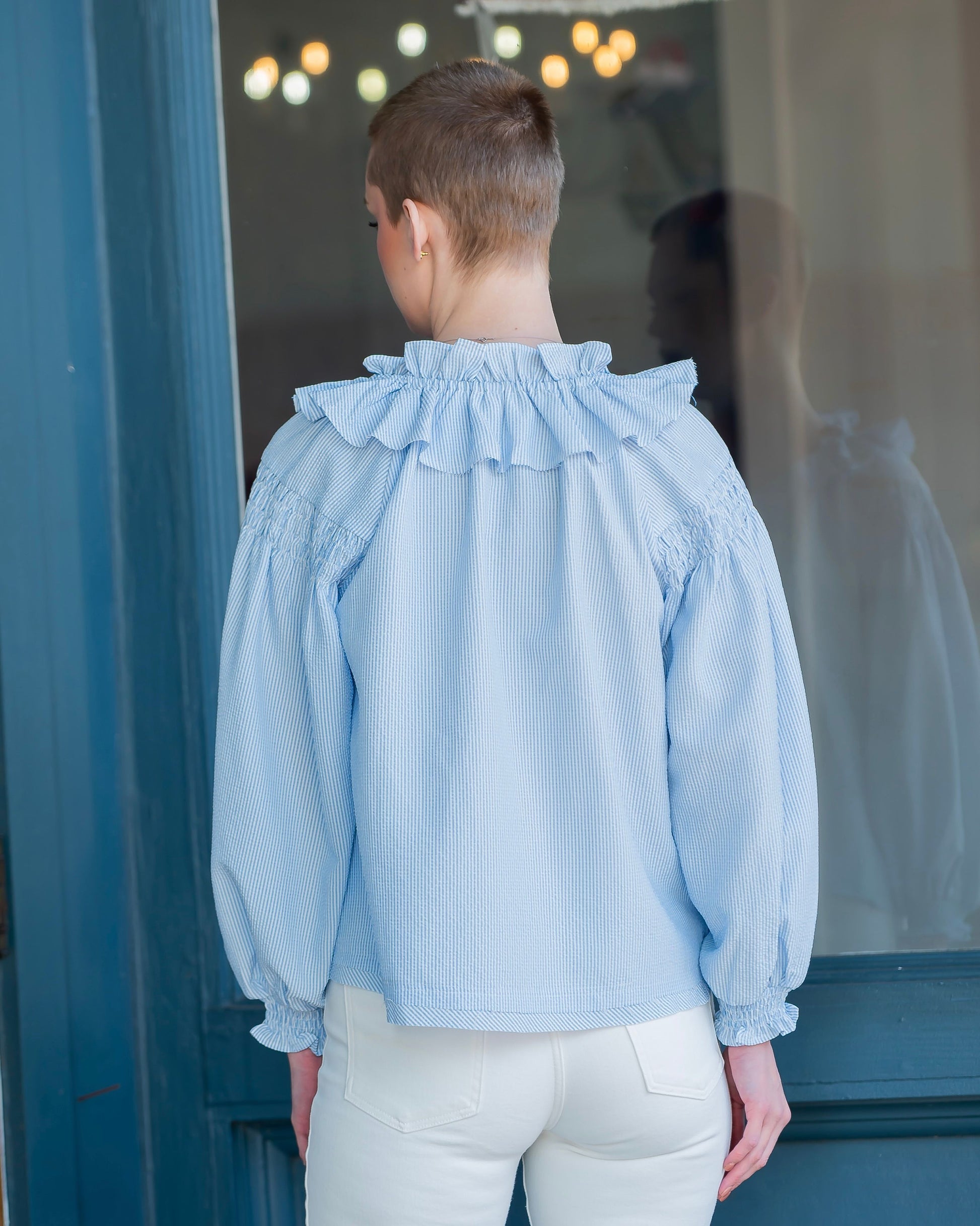 Make a statement in the Freeport Pinstripe Ruffled Collared Blouse—where vintage charm meets modern flair. Billowing balloon sleeves and a ruffled collar create instant drama, while crisp light blue and white pinstripes keep things fresh and sophisticated. Smocked wrists add a delicate finishing touch that's both elegant and playful. Dress it up or down for a look that's undeniably you.