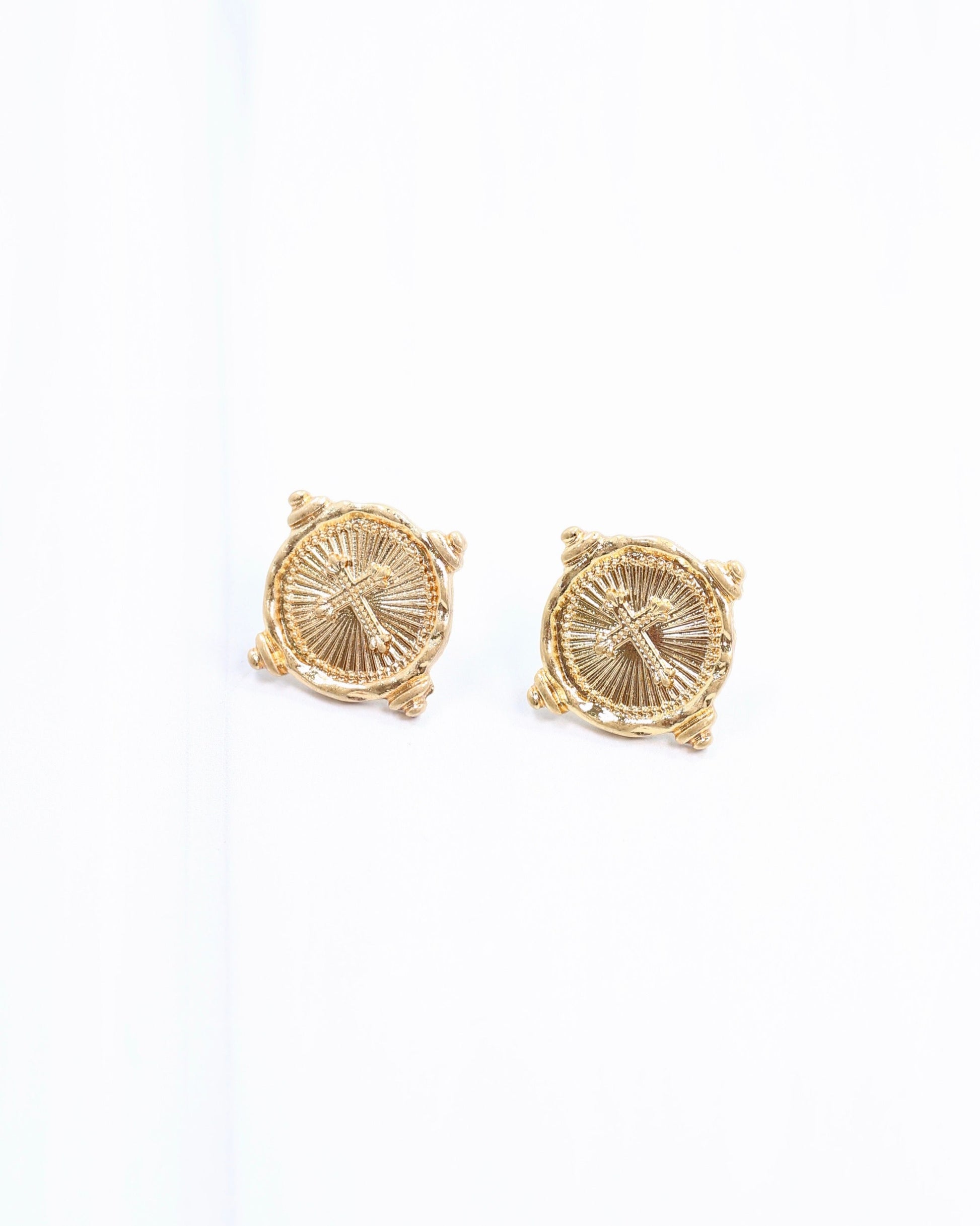Add a touch of edgy elegance with the Capitola Cross Stud in Worn Gold. The textured round stud features a ribbed texture and a cross in the center, giving off a unique vibe. Made with titanium posts for durability. Perfect for those who want to stand out from the crowd!