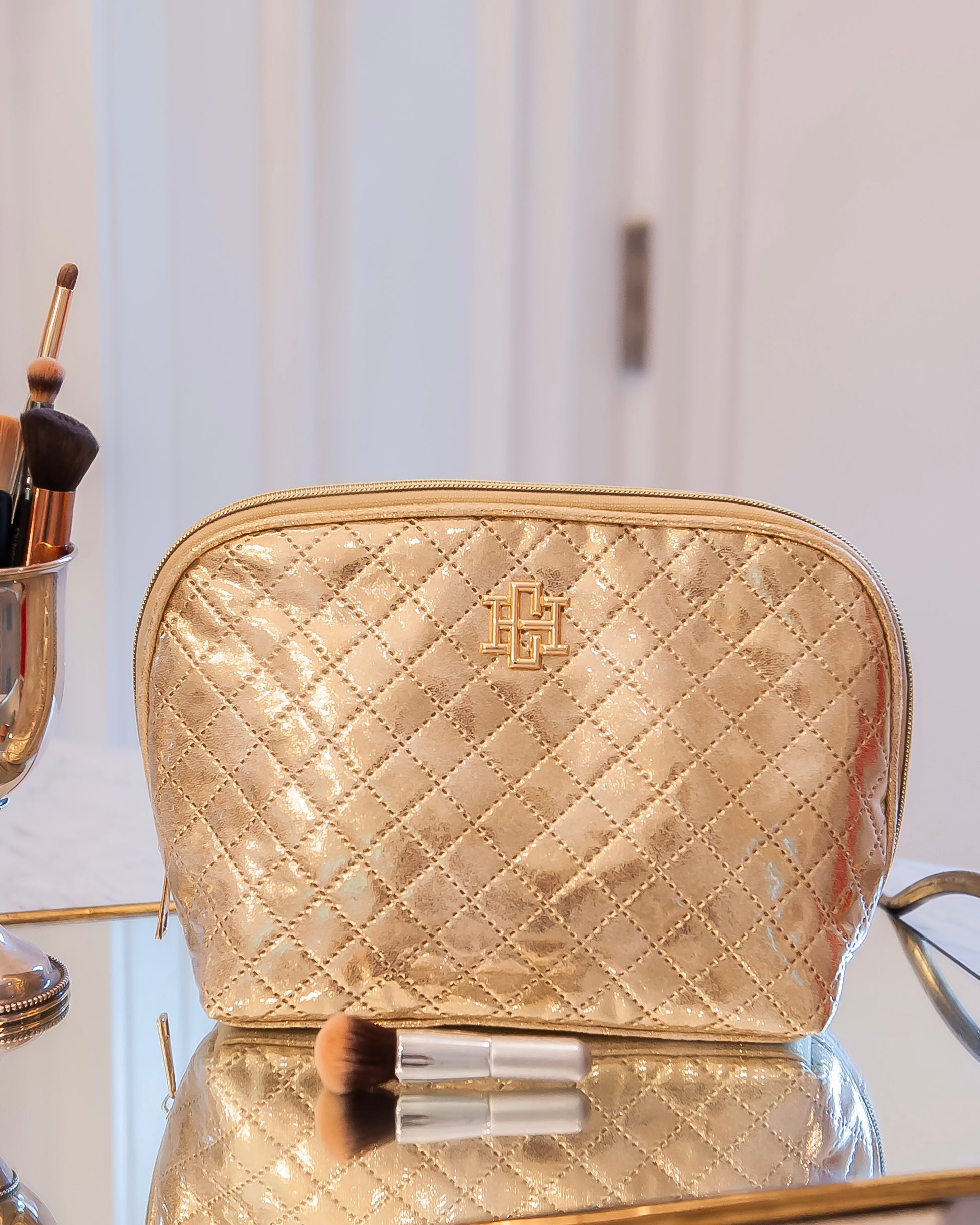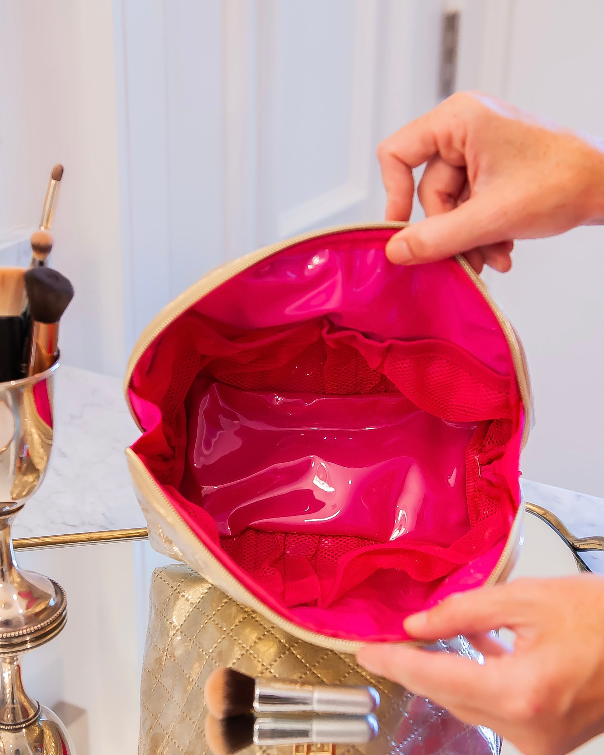 This beautiful vegan patent leather pouch is part of our makeup and travel collection and features a stylish quilted fabric design. The elongated zipper provides easy access, making it perfect for organizing makeup, toiletries, and hair accessories. The spacious interior is lined with hot pink with a clear protective fabric that is easily wipeable. It also has mesh pockets to keep cosmetics neatly stored and accessible.