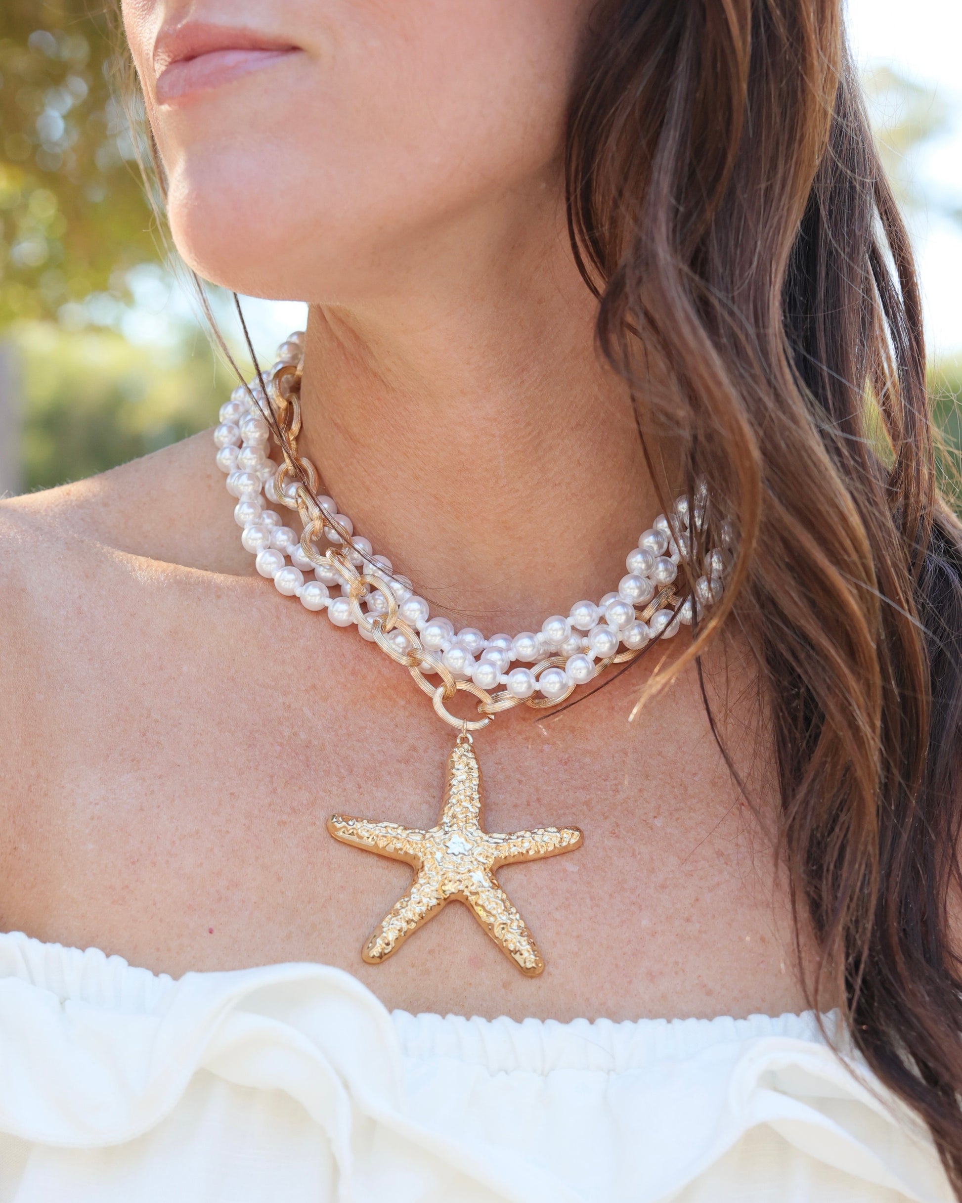 Starfish charm meets pearl elegance in this playful gold layered necklace. A solid gold starfish paired with lustrous pearls and a polished link chain creates instant coastal magic. Perfect for stacking or wearing solo—pure ocean-inspired fun!