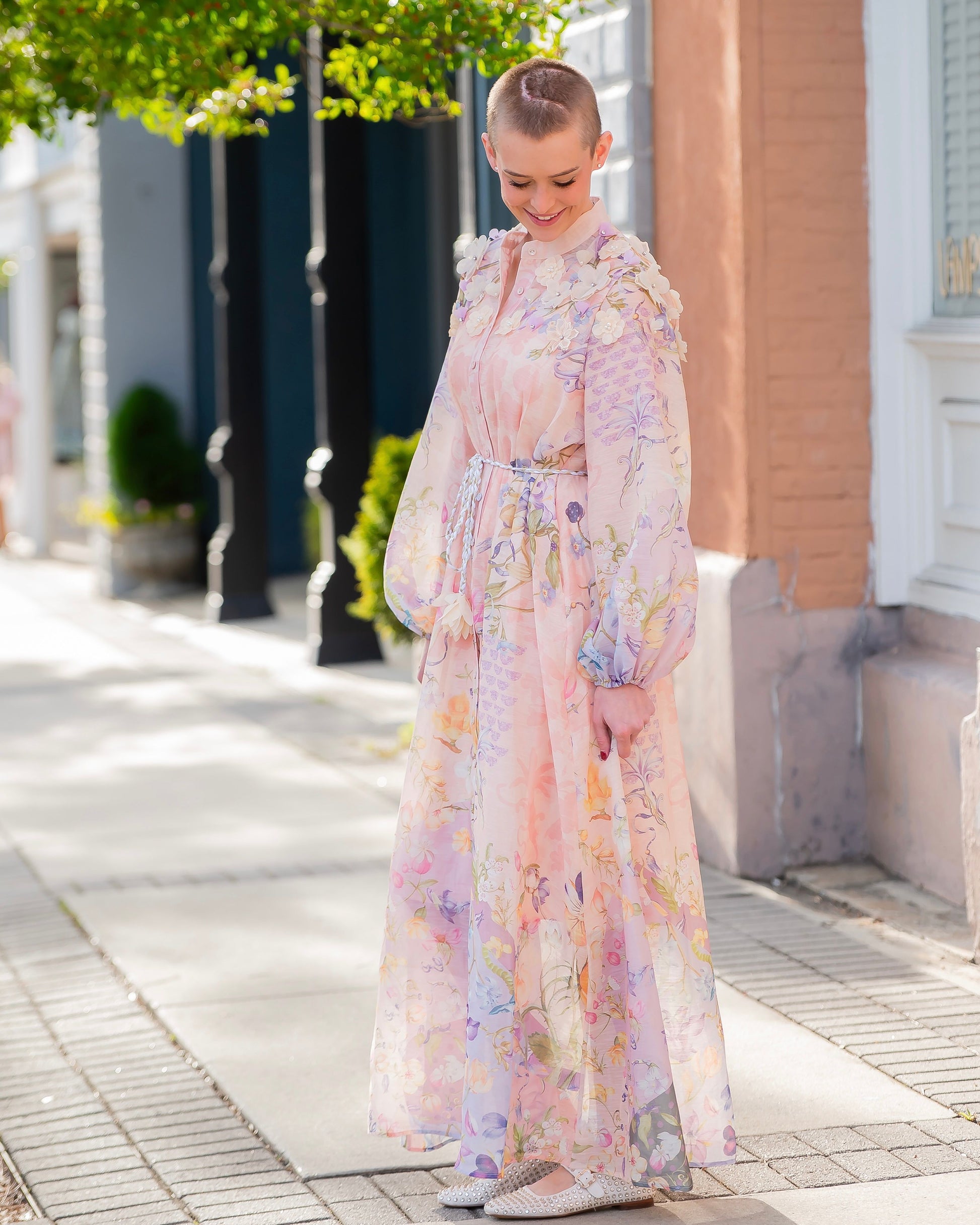 Introducing the Abigail Lavender Floral Button Down Dress—a charming piece that effortlessly blends elegance with playful style. This long dress features a gorgeous floral pattern throughout, paired with delicate floral decoupage accents adorning the upper chest for added visual interest. The coordinating coral under camisole peeks through for a layered, sophisticated look. Complete with a braided white and gold belt finished with decorative flower ends, this dress is perfect for anyone seeking a fresh, feminine aesthetic that transitions beautifully from day to evening.