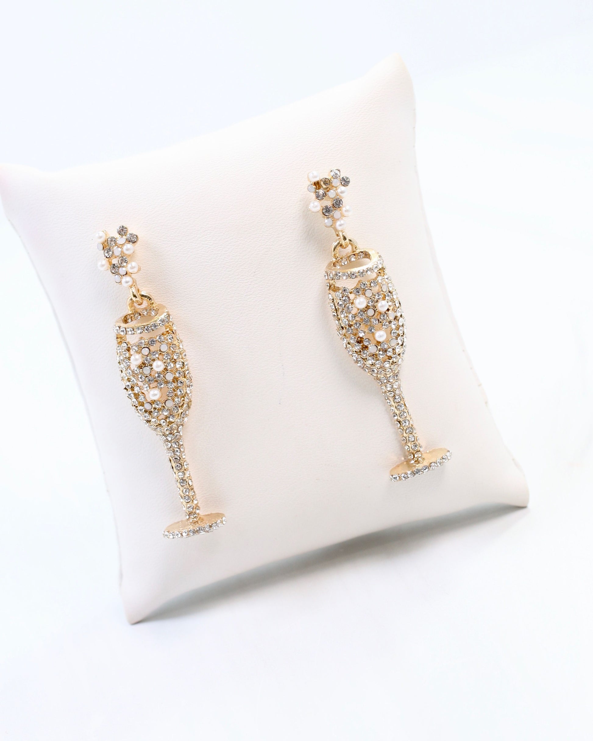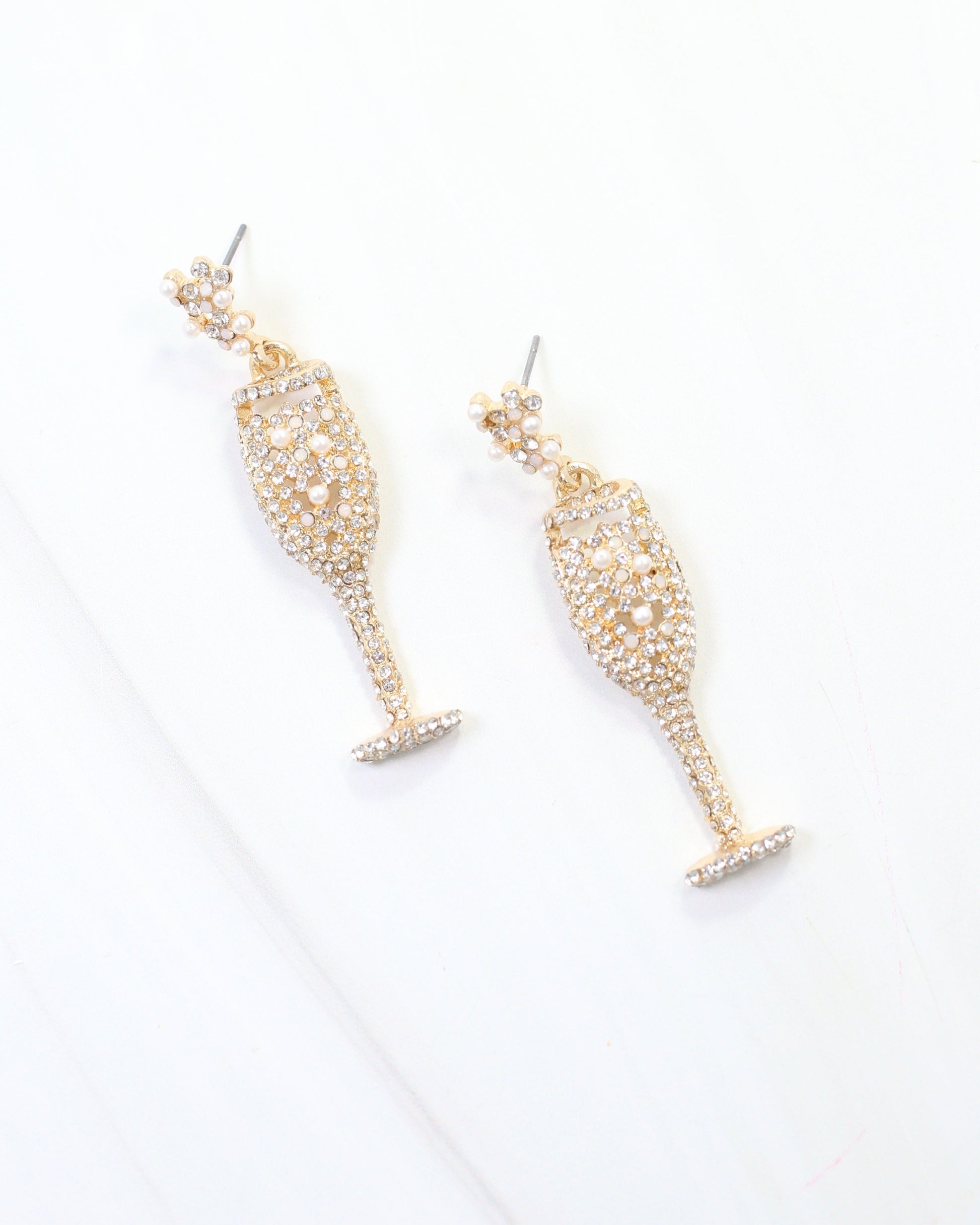 The Cheers to You Earrings in Gold feature sparkling pave champagne glasses accented with elegant pearl details. These stylish earrings add a glamorous touch, perfect for shining at any celebration or special occasion.