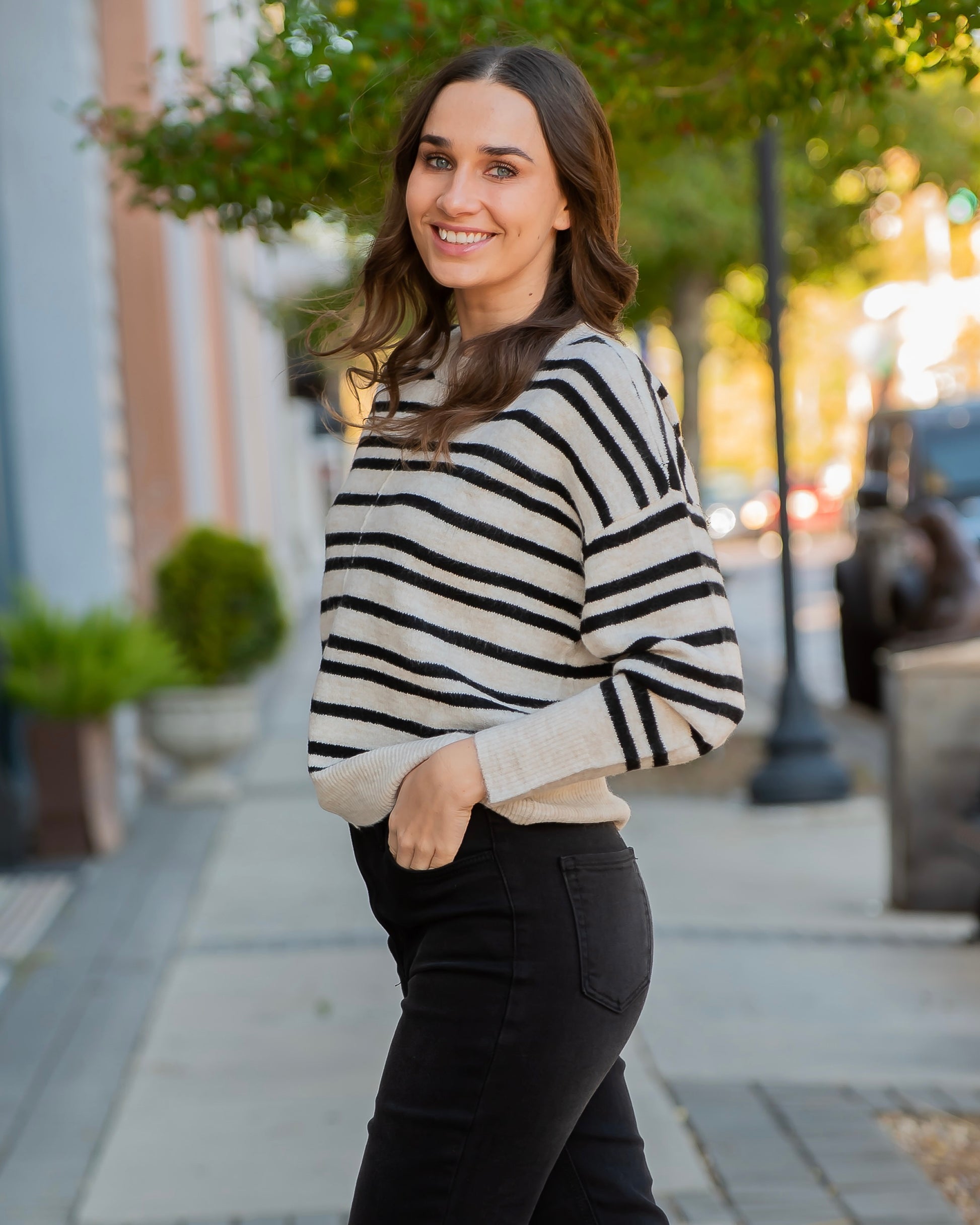This Cheverly Striped Sweater in Black features a comfortable round neckline and long sleeves with a relaxed drop shoulder design for effortless style. Its front seam detail and contrast solid trim add subtle visual interest to this knit pullover. Lightweight and unlined, it’s perfect for layering and keeping cozy without bulk. Ideal for everyday wear, it blends comfort with a polished look.