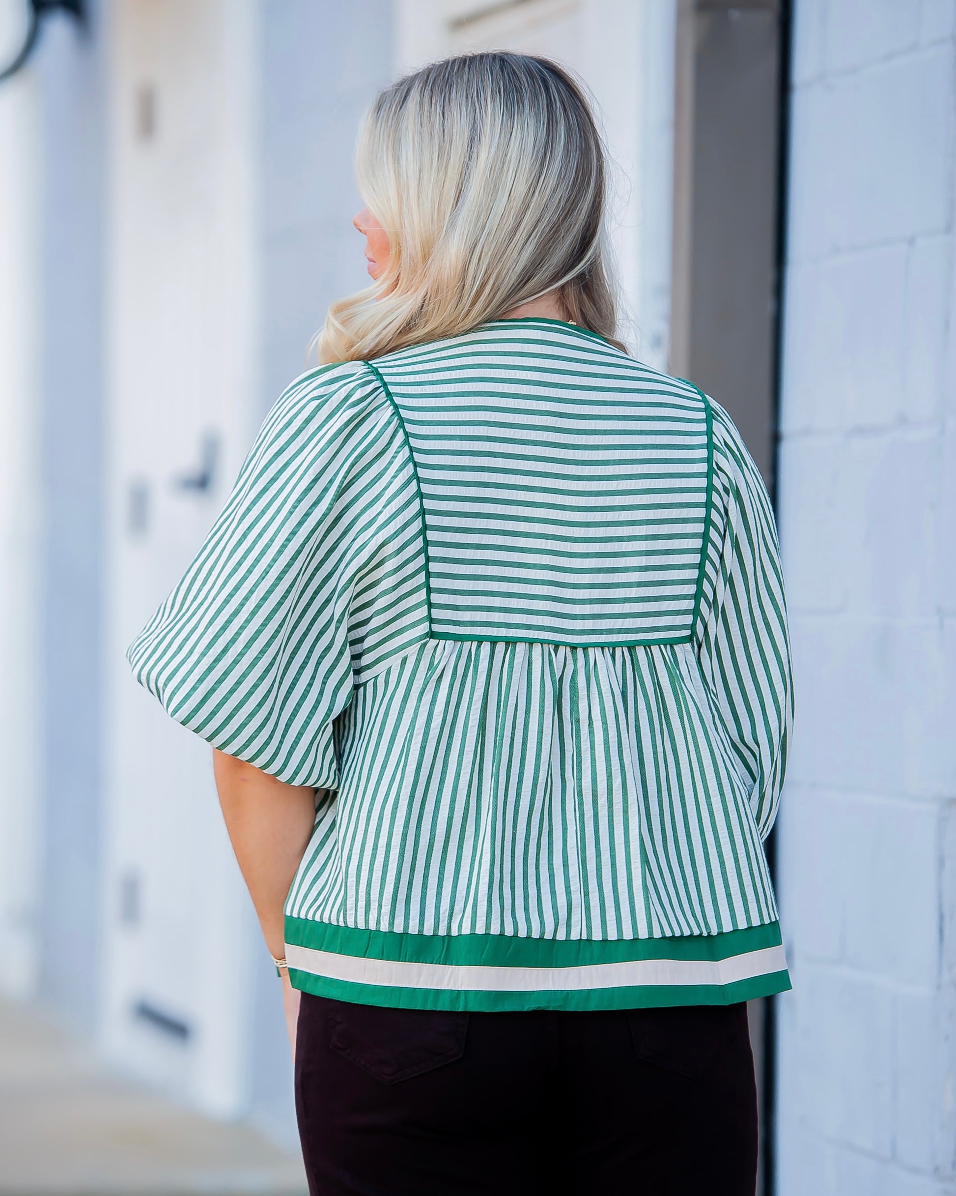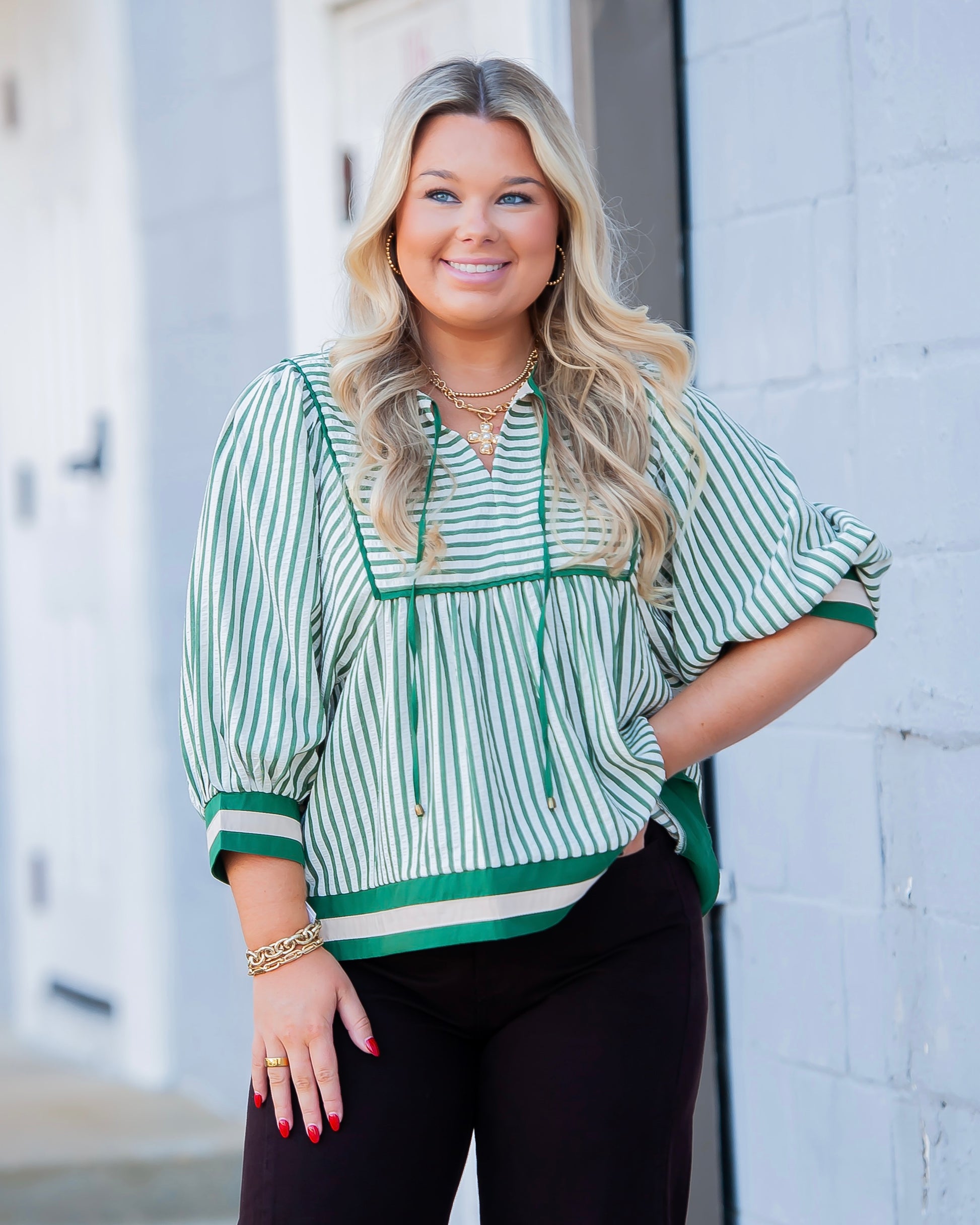 The Chrissy Striped Top in Green brings a fun twist to your wardrobe with its cream background and lively hunter green colored stripes. Featuring playful multicolor bands at the hem and sleeves, this lightweight woven top offers ¾ sleeves and a comfortable, non-sheer fit perfect for layering or wearing solo on sunny days. Unlined and breezy, it’s your go-to for effortless style with a splash of color.