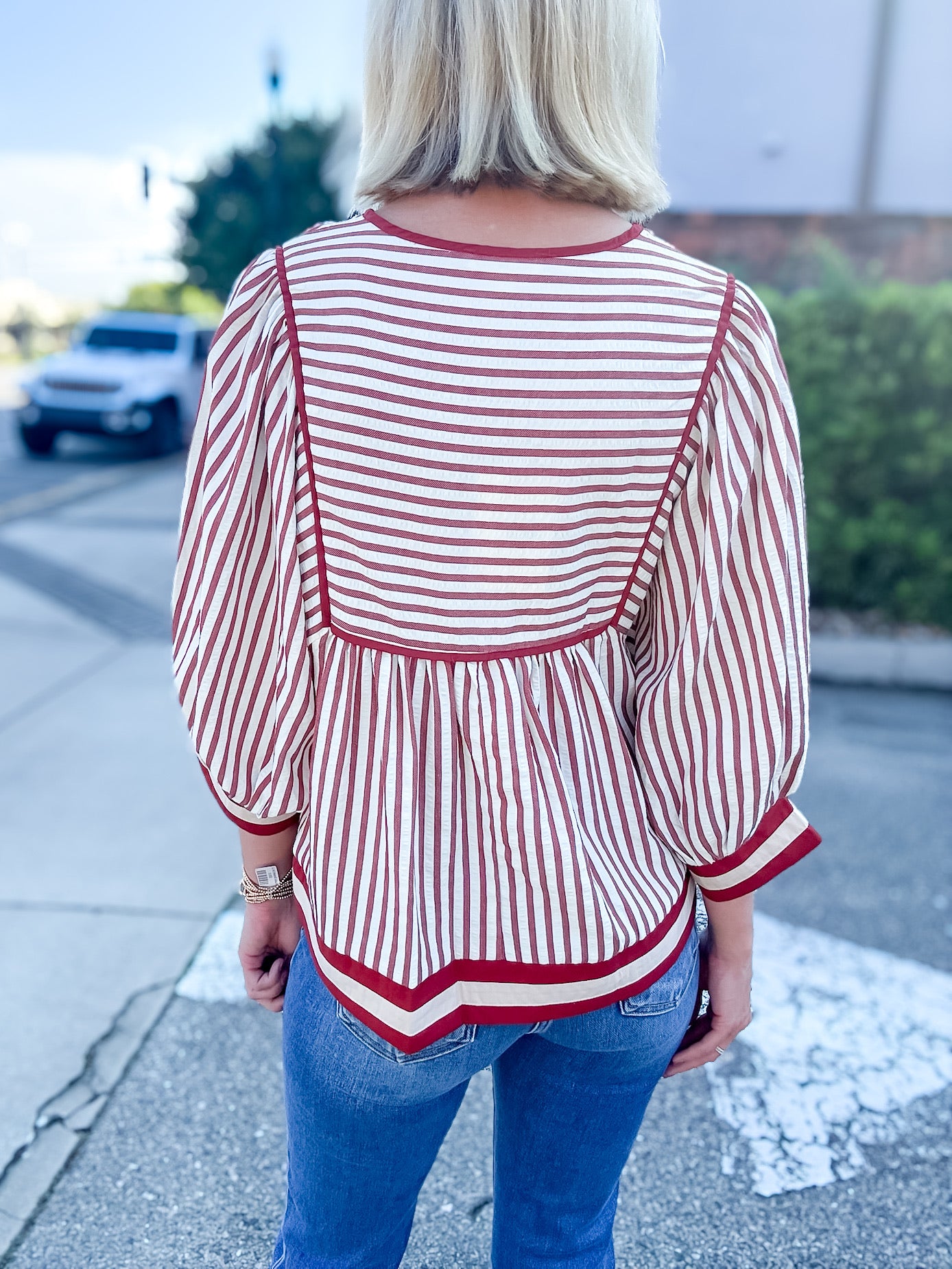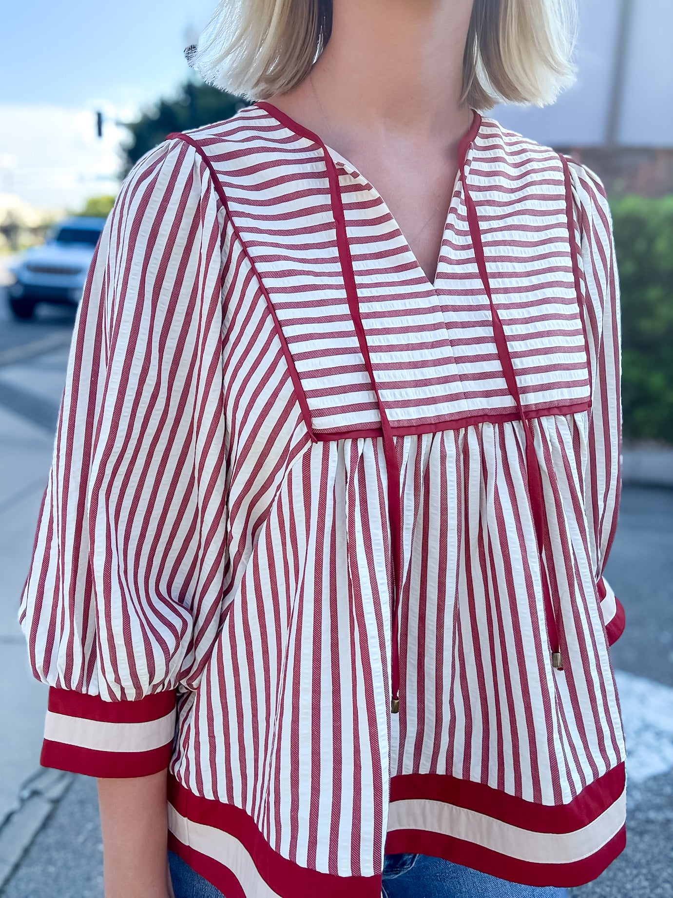 The Chrissy Striped Top in Garnet brings a fun twist to your wardrobe with its cream background and lively garnet colored stripes. Featuring playful multicolor bands at the hem and sleeves, this lightweight woven top offers ¾ sleeves and a comfortable, non-sheer fit perfect for layering or wearing solo on sunny days. Unlined and breezy, it’s your go-to for effortless style with a splash of color.