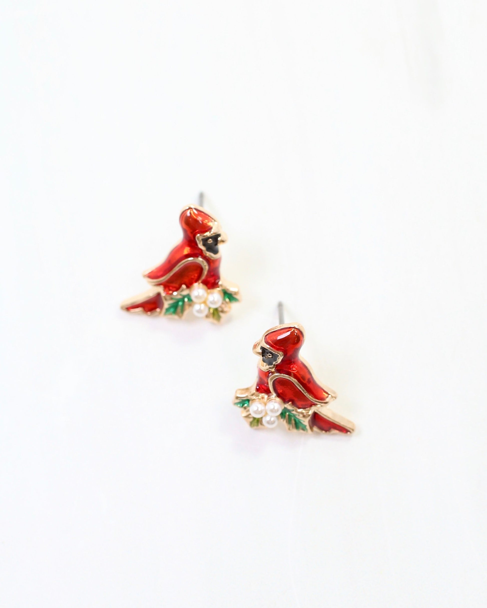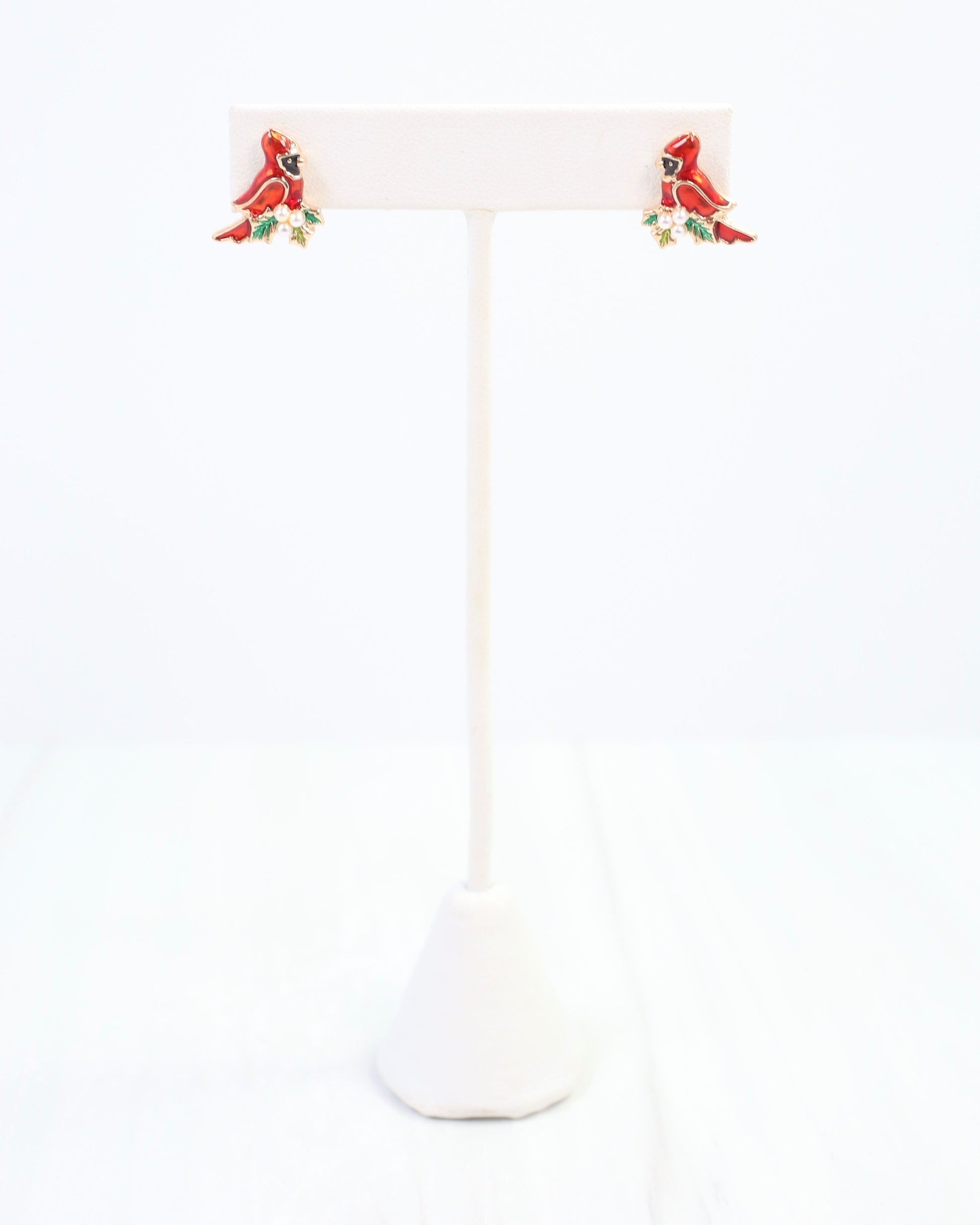 These Christmas Cardinal Stud earrings feature a red enamel cardinal perched on a delicate holly leaf accented with pearl holly berries. Subtle yet festive, they add a refined seasonal touch to any outfit, perfect for holiday gatherings or everyday winter style.