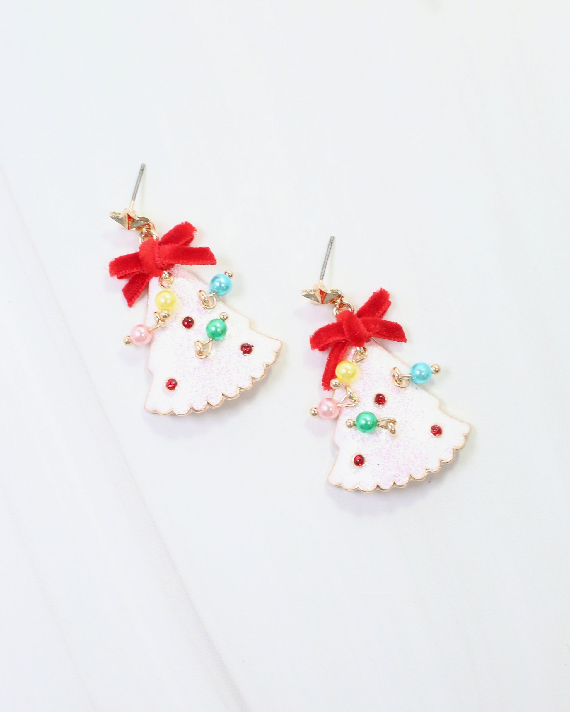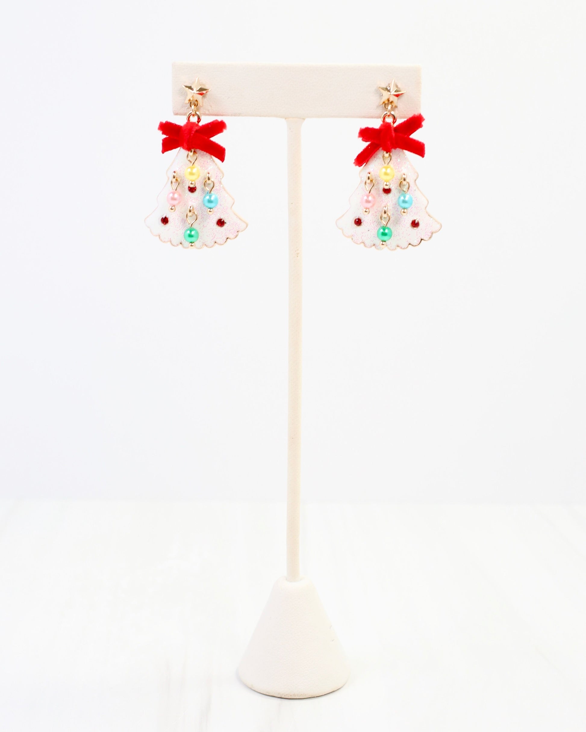 Celebrate the season with these fashionable Christmas Tree Earrings in white glittered enamel. Featuring sparkling red crystal stones, elegant multicolored dangling pearls, and a plush velvet bow, each earring is topped with a charming star post for a festive finish. Perfect for adding a touch of holiday sparkle to any outfit.