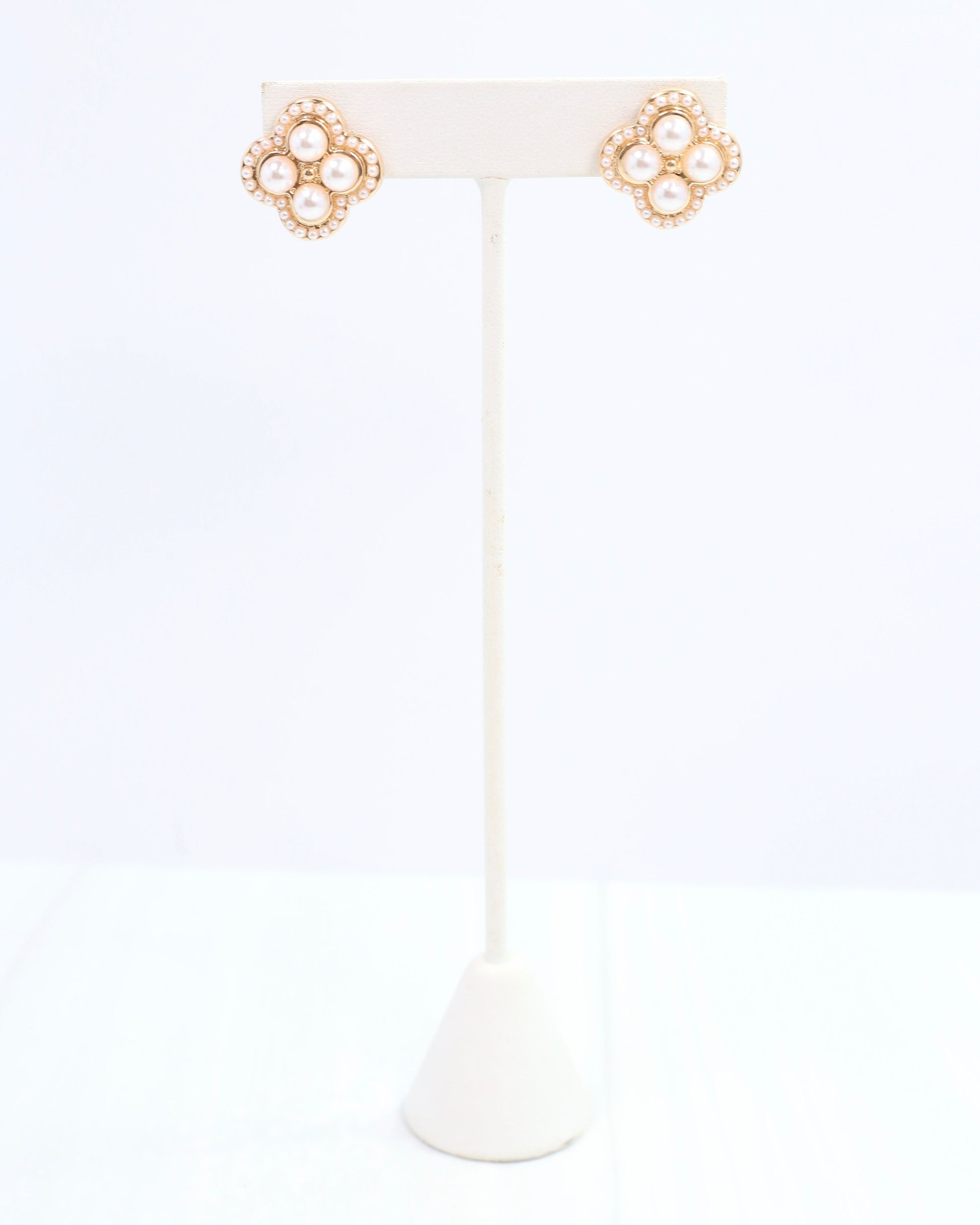 Bring a touch of elegance and class to any outfit with our Ciebon Clover and Pearl Stud Earrings. Made with four stunning pearls and a delicate pearl trim, these gold earrings will add a touch of sophistication to any look. Perfect for adding a subtle, yet stylish, touch to your jewelry collection.