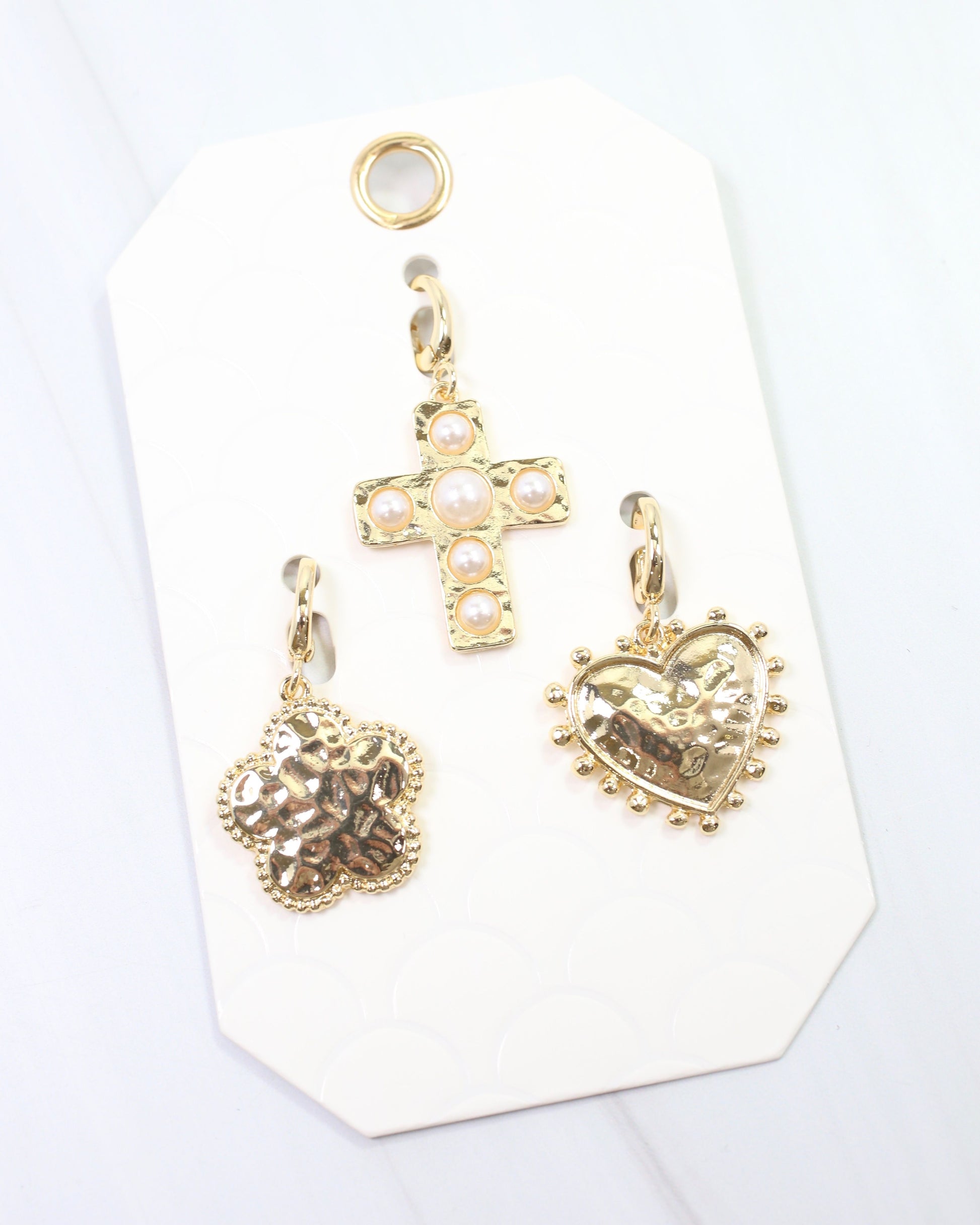 Add a playful touch to your scarf necklaces with the Clampett Charm Set Gold. This trio features a lucky clover flower, a delicate cross adorned with pearls, and a stylish heart studded for extra flair. Perfect for layering or gifting, these charms bring effortless detail and charm to any look.