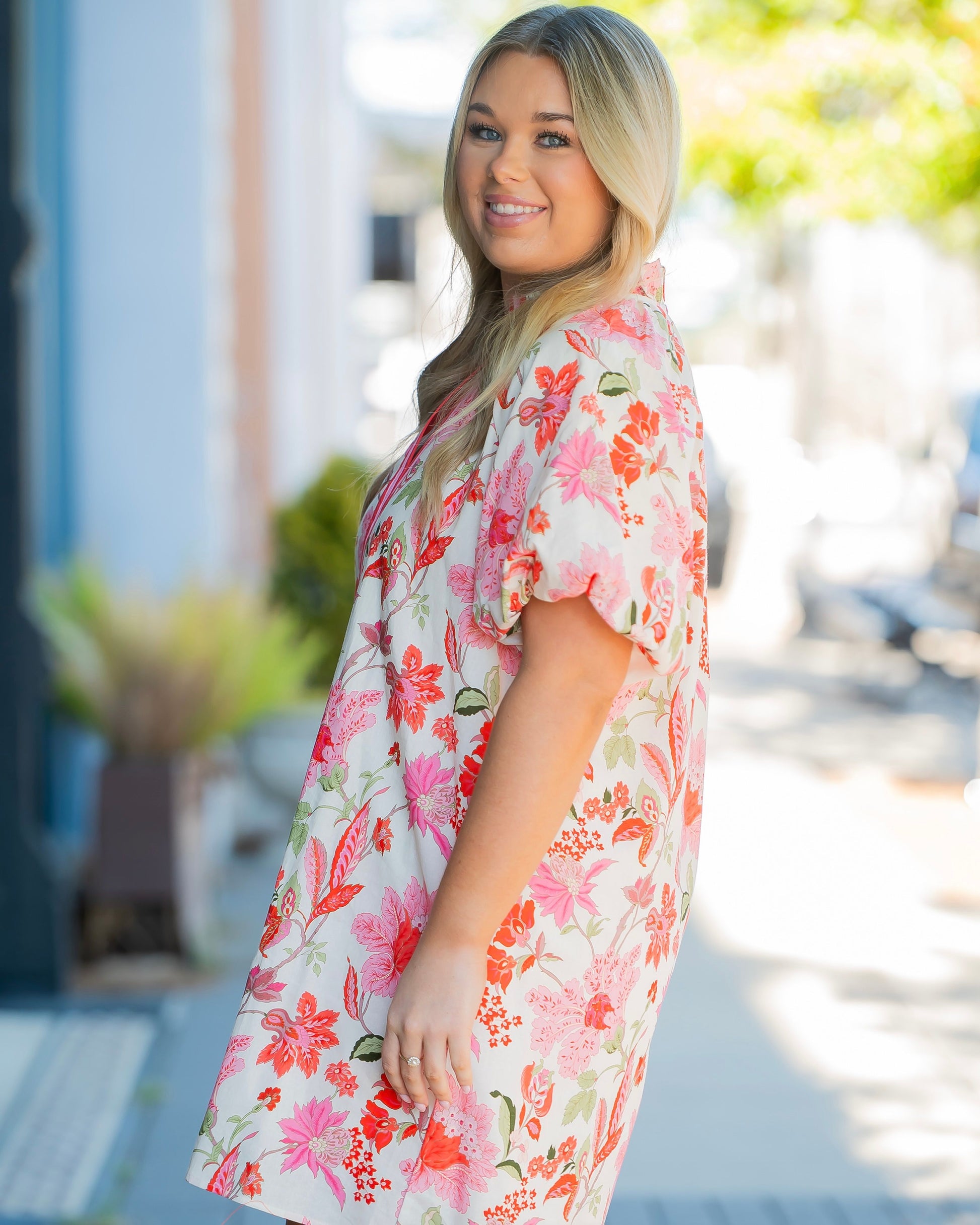 Make a bold statement in the Everly Garden Party Floral Dress. This isn't your typical floral—it's a daring blend of romance and edge. The striking ruffle collar commands attention while the V-neckline exudes confidence. Bubble sleeves add unexpected dimension, and functional side pockets prove style doesn't mean sacrificing practicality. Fearless florals for those ready to stand out and own the room.
