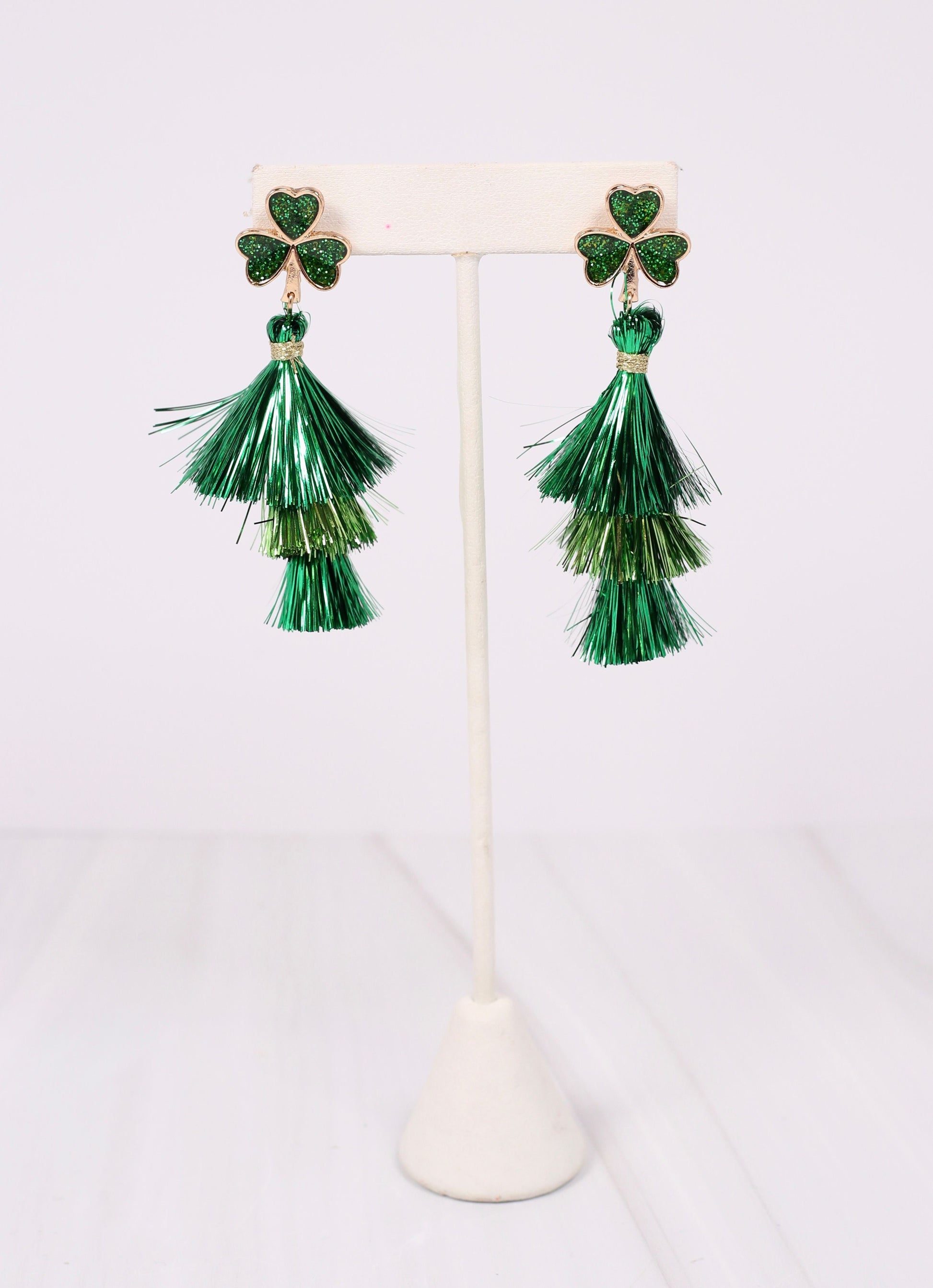 This earring is so festive! It has a glittery shamrock post and metallic tinsel tassels below. The post back is made of titanium as well.