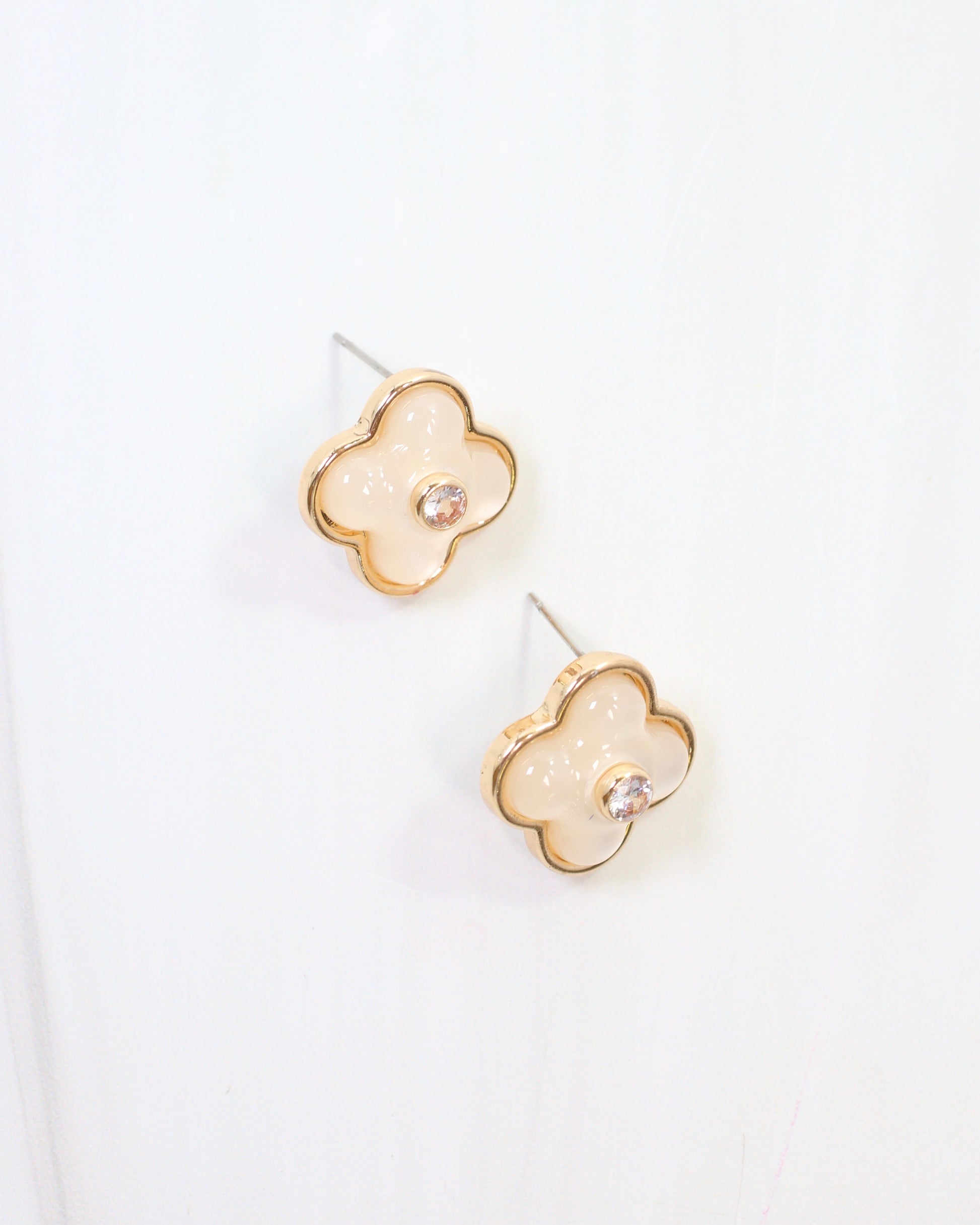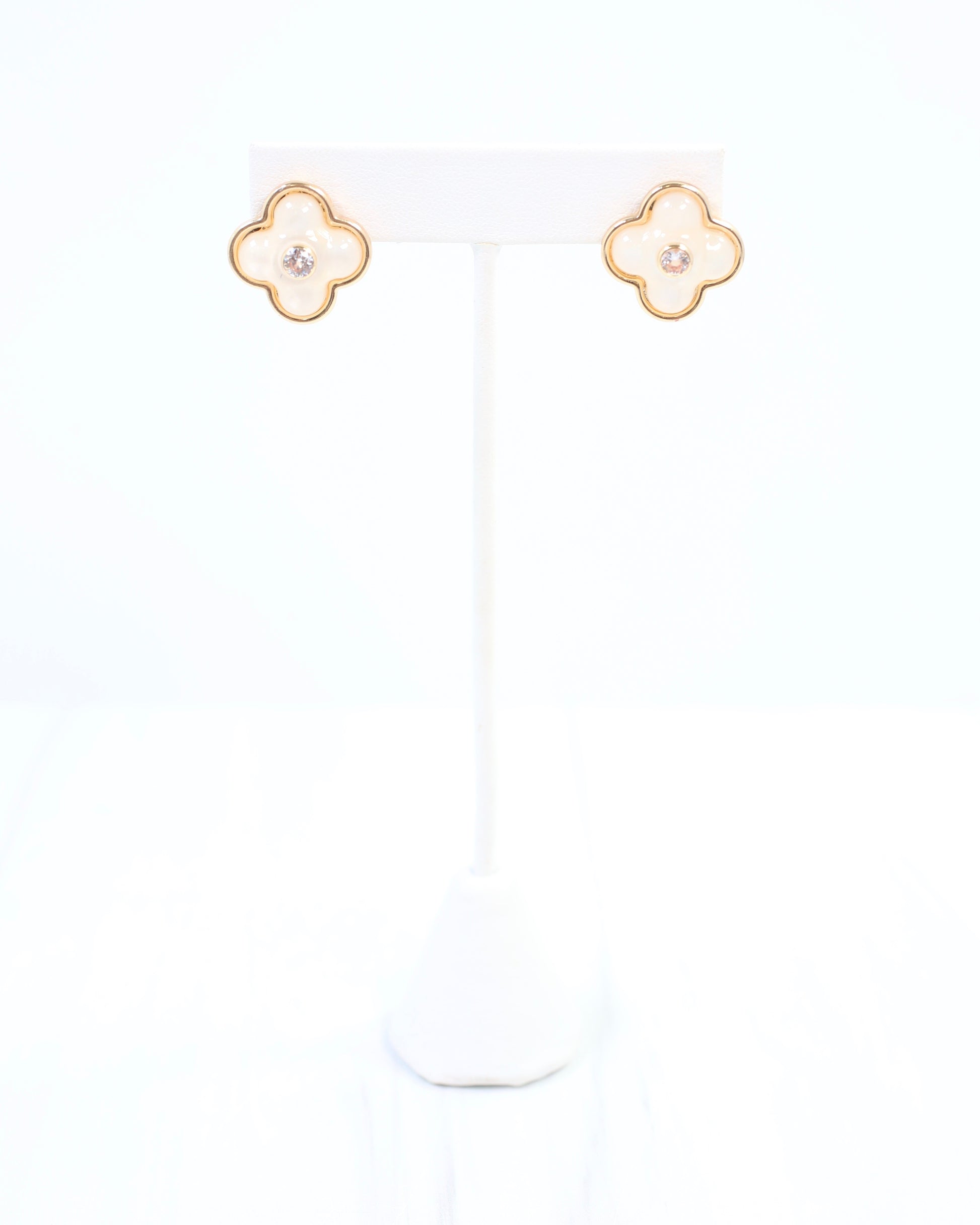 The Colby Clover Stud Mother of Pearl features a stunning pearl centerpiece encircled by a sleek gold edge, with a sparkling diamond set in the center. This fashionable stud blends timeless elegance with modern design, perfect for adding a refined touch to any outfit.