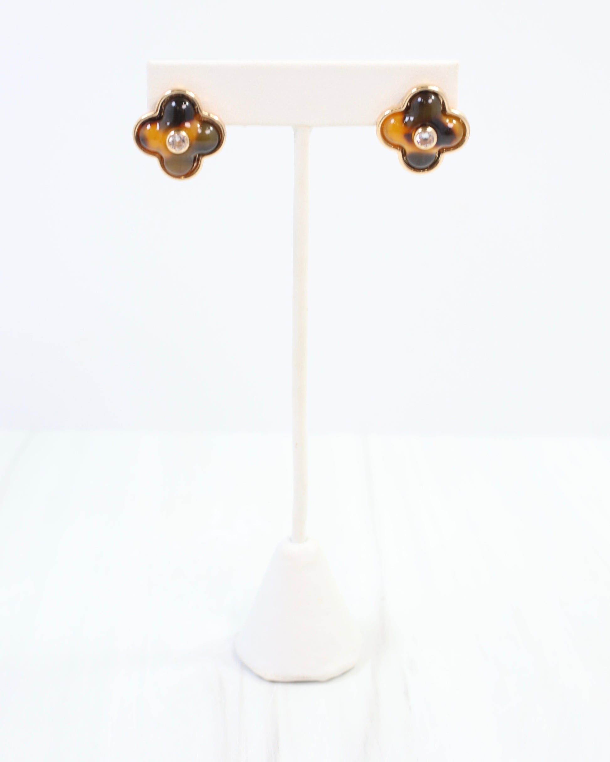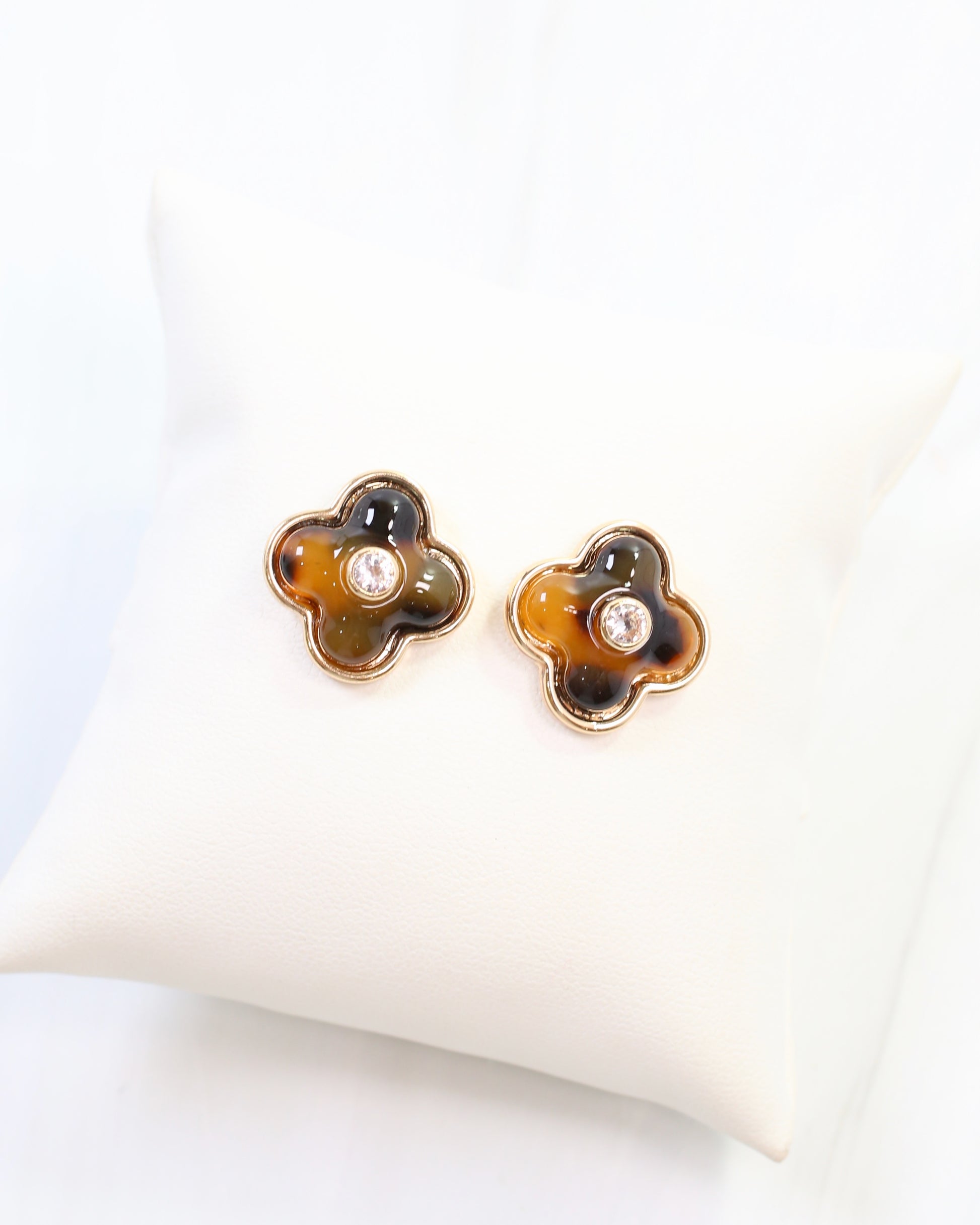 The Colby Clover Stud Tortoise combines classic tortoise patterning with a polished gold edge, centered by a dazzling diamond. This stylish stud offers a chic and sophisticated accessory that effortlessly enhances any outfit with a touch of luxury.