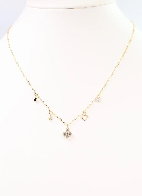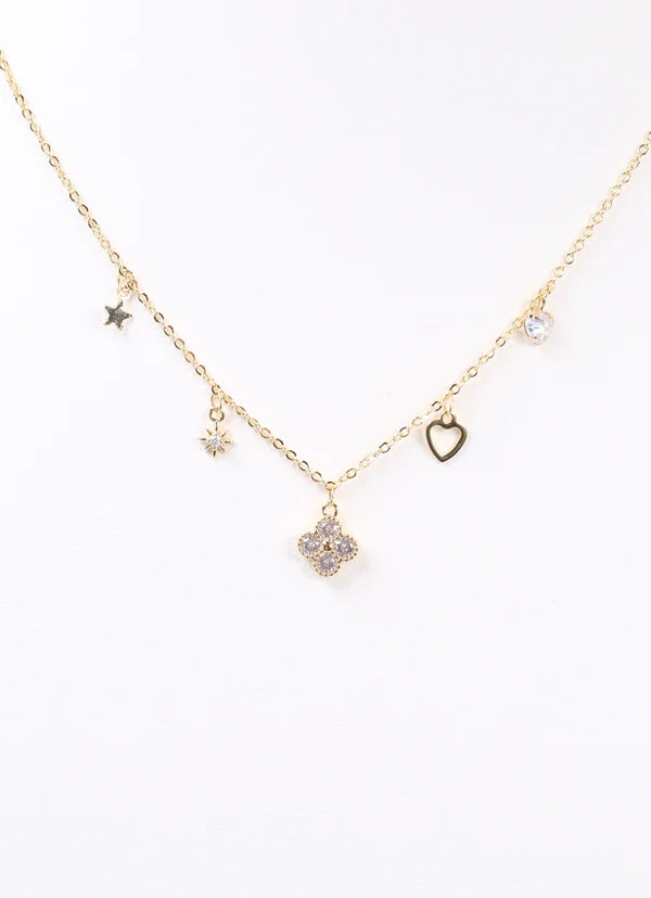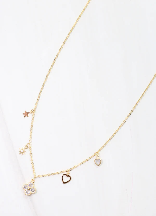 This delicate necklace features five petite charms with CZ accents as well. It's a great choice when you just need a little accessory pop to your outfit.