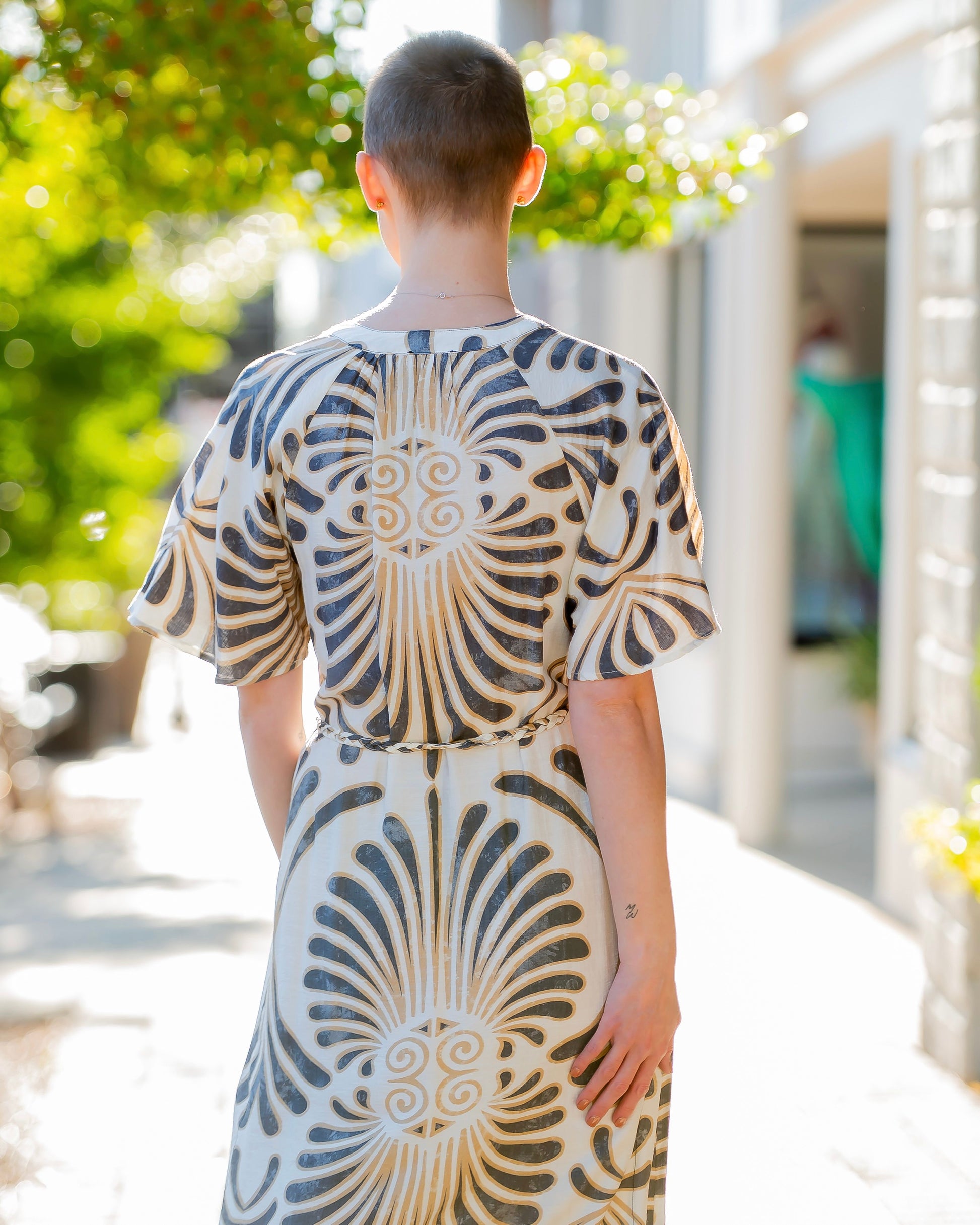 Make a statement in the Elle Bold Print Midi Dress, where eye-catching prints meet effortless elegance. This midi stunner features a flattering V-neck with trapunto stitching for added dimension, snap closure for easy dressing, and an adjustable waist tie that lets you customize your silhouette. Perfect for turning heads at brunch, date night, or whenever you want to feel fabulous. Bold, beautiful, and undeniably you.