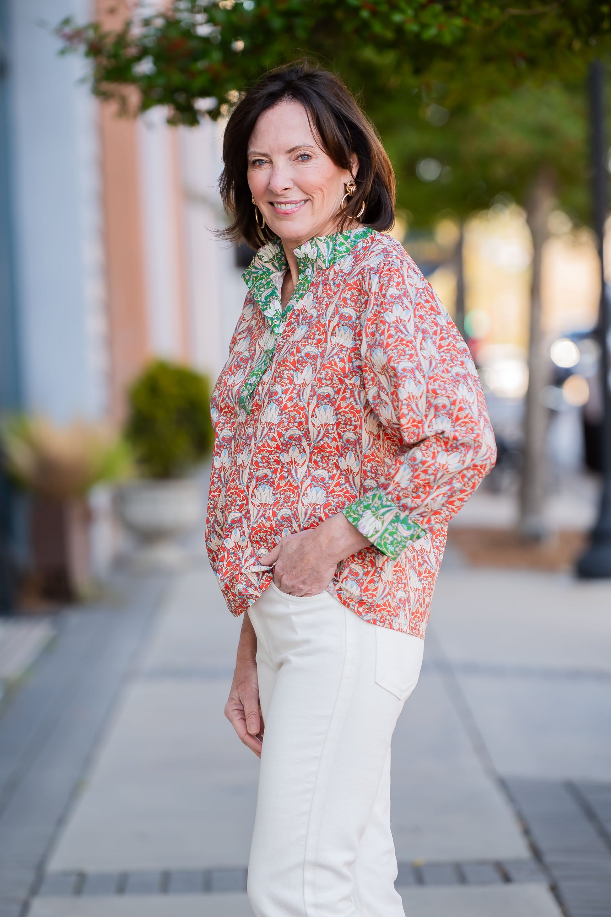 Blythe Wide Color Block Floral Printed Top Make a statement with bold color blocking and eye-catching floral prints. This fashion-forward top features a striking wide contrast banded neckline and three-quarter length sleeves finished with contrast cuffs for added dimension. The quarter button-down closure offers easy styling versatility, while the mixed woven fabric in color block florals brings movement and visual interest to any outfit. Perfect for layering or wearing solo, this piece effortlessly transitions from casual to polished.