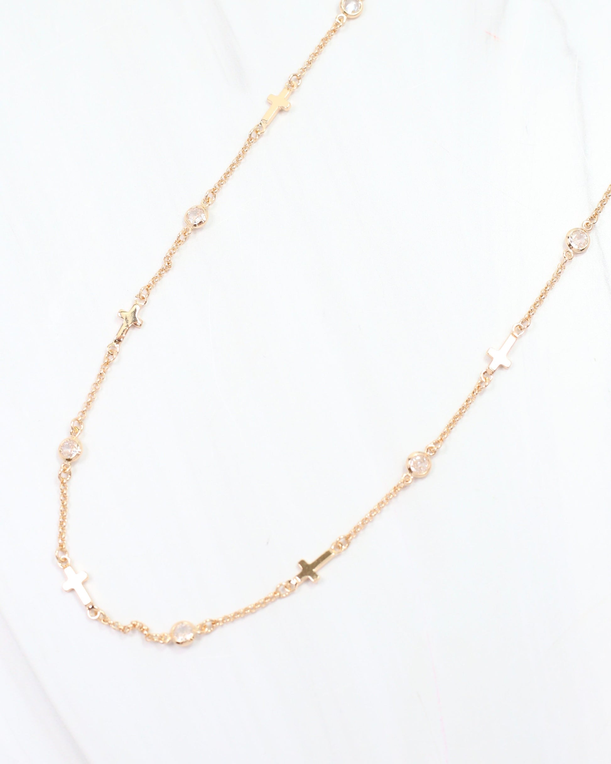 Add a touch of charm with the Eliza Cross Necklace in Gold. This delicate chain features tiny side crosses and sparkling CZ circles, creating a playful yet elegant look perfect for everyday wear or layering. Light and lovely, it’s a subtle way to shine with a hint of whimsy.