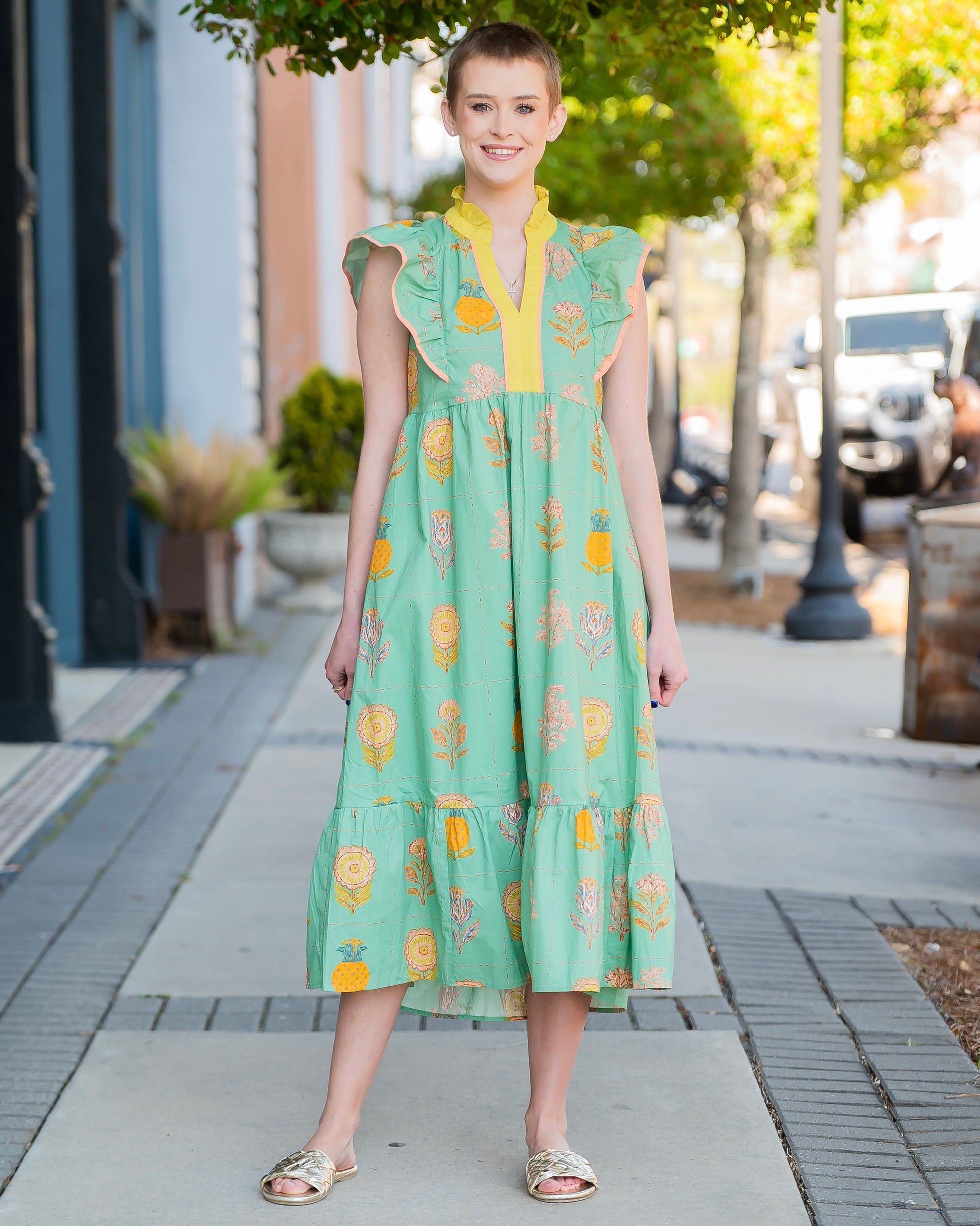 Step into spring with the Aria Floral Print Midi Dress—a breezy essential that celebrates botanical beauty. The split V-neckline and contrast trim create a modern edge, while ruffled cap sleeves with coordinating trim add playful dimension. Tiered layers build movement through the midi length, giving you a dress that twirls as well as it photographs. Unlined for breathable comfort, this is your go-to for effortless style from season to season.
